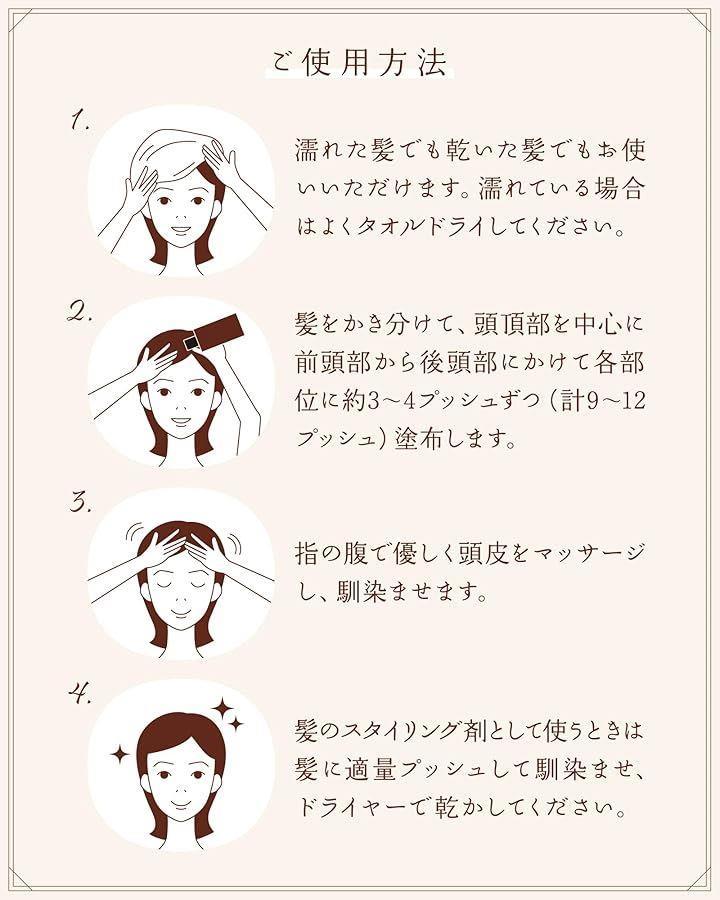 ・髪をかき分け、頭頂部を中心に前頭部から後頭部にかけて各部位に約3~4プッシュずつ(計9~12プッシュ)塗布します。