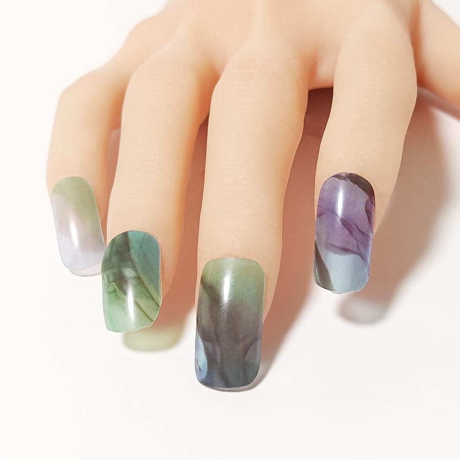 ライトで硬化させる半硬化タイプのジェルネイルシール。アルコールインクアートをベースにしたデザイン。色が美しく爪に映えるよう、少し濁りをプラスして自身の爪のカラーが反映するのを抑えました。