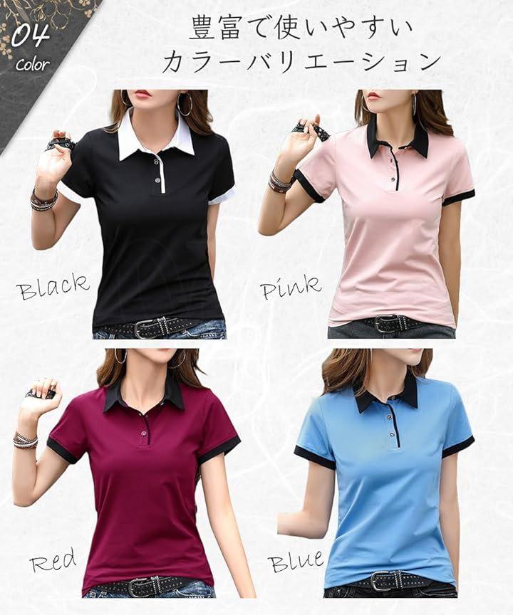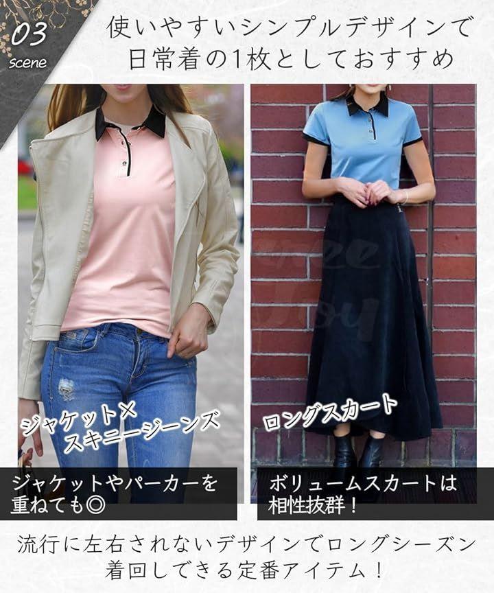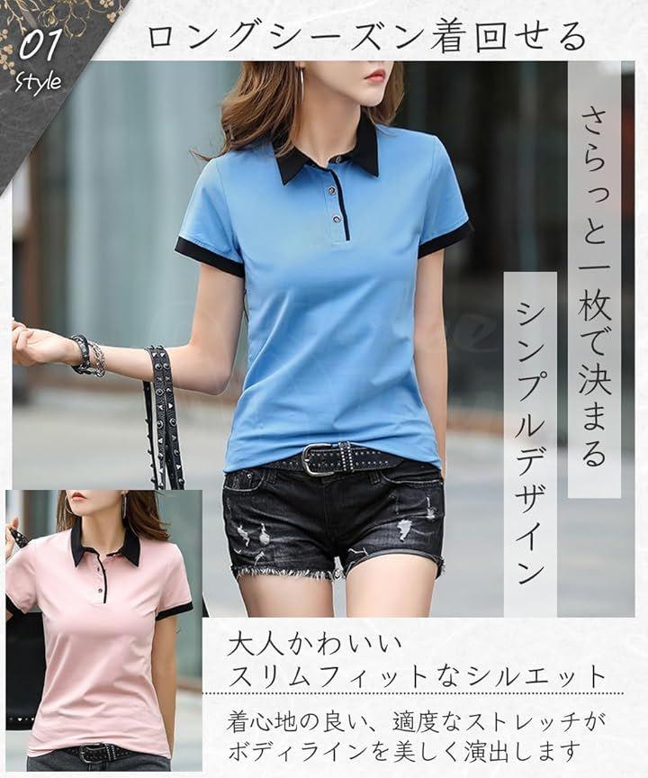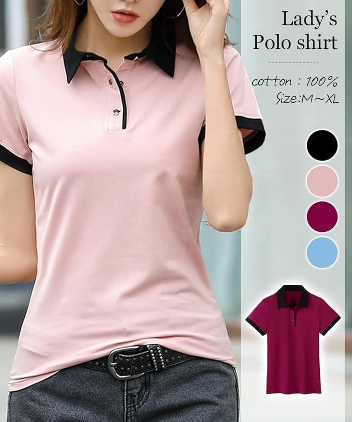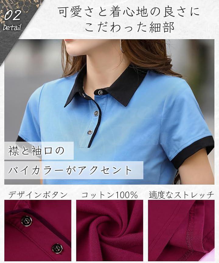 「デザイン」オシャレなバイカラーポロシャツ。スリムなデザインは女性らしい美しいシルエットを演出。