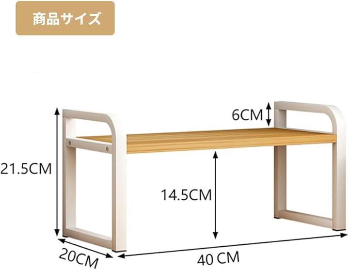 「負荷能力」デスクシェルフのサイズは幅40x奥行20x高さ21.5m、材料は鋼材とパーティクルボードです。