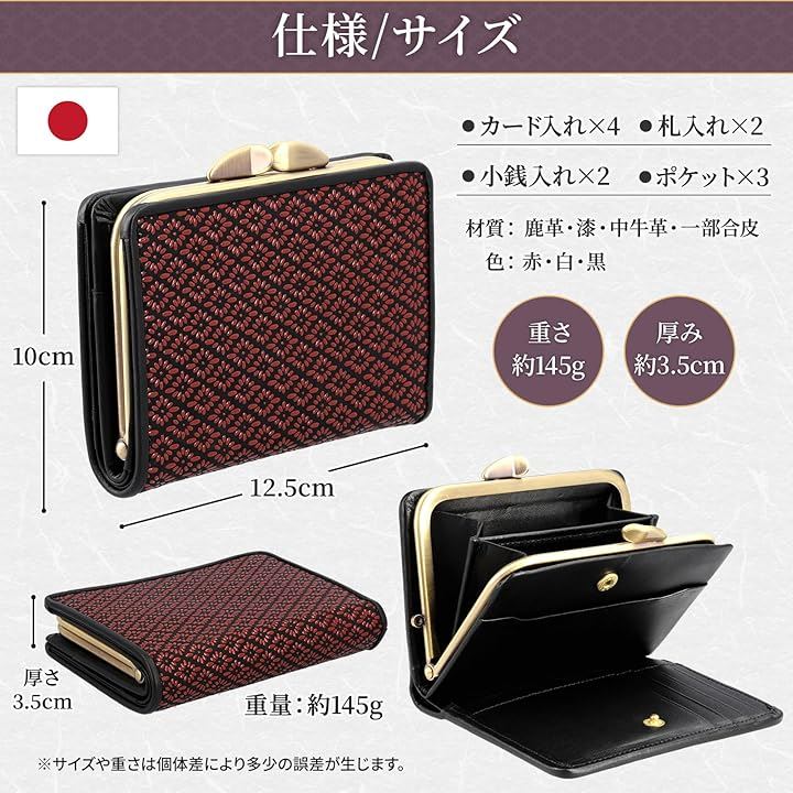 「 スペック 」口金式 がま口財布/ 小銭入れ(仕切り付)x1 札入れx2 カード入れx4 ポケットx3 SIZE:約)横12.5x縦10x厚さ3.5cm 重量:約)145g 素材:(外面)鹿革に本漆(中面)牛革 一部合皮 日本製