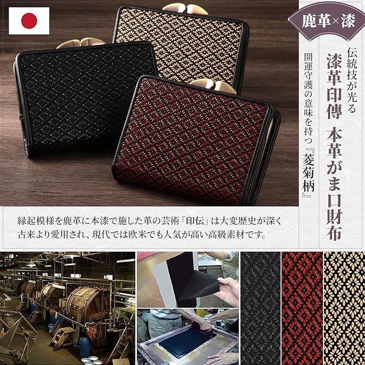 「 特徴 」レザーのカシミヤといわれる軽量で柔らかく丈夫な鹿革に本漆で美しい菱菊紋を象ったガマ口財布です。