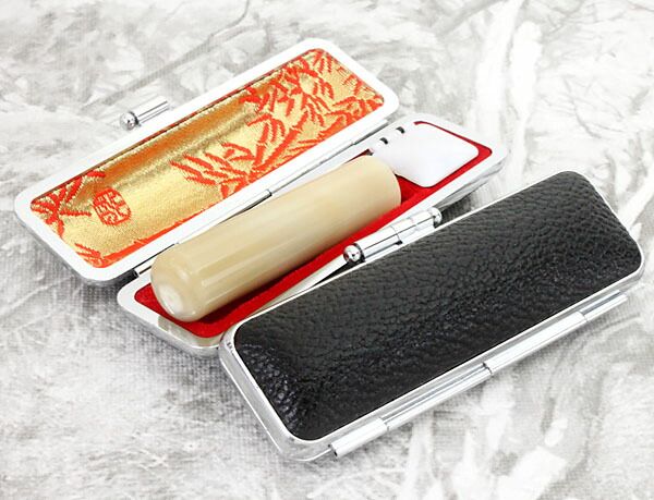 Seal/Stamp Set: White Ox Horn, 18mm, Black Leather Seal, with Case and Ink Pad. A perfect gift for women, men, couples, weddings, coming-of-age celebrations.