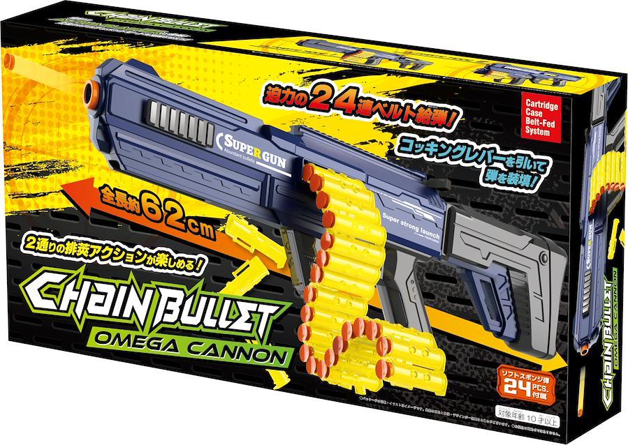 迫力のベルト給弾が楽しめるチェインバレットシリーズ!全長約62cm大迫力ボディ!同シリーズの「アルファブラスター」との合体が可能。弾はソフトスポンジを使用。セット内容:本体×1、照準器×1、薬莢×24、弾丸×24対象年齢:10歳