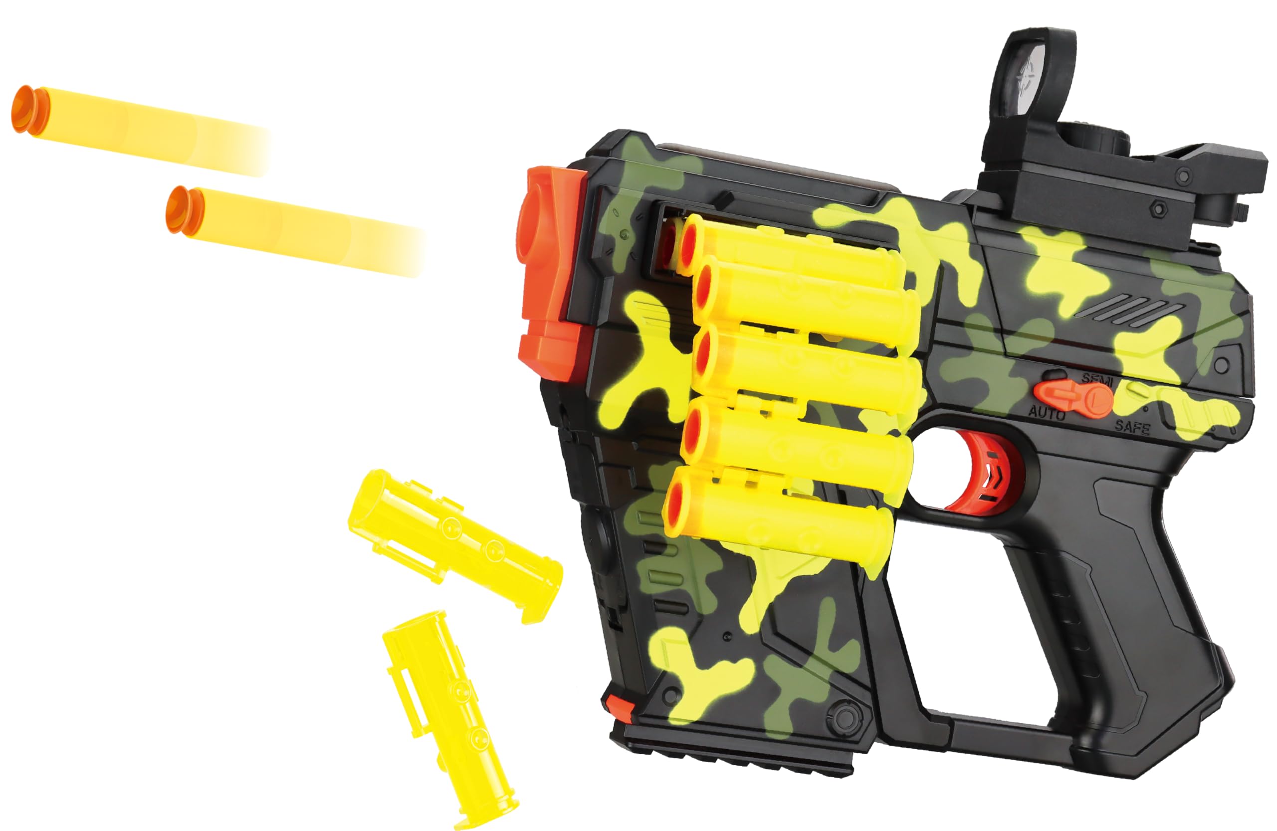 迫力のベルト給弾が楽しめるチェインバレットシリーズフルオート連射モードとマニュアルモードが切り替えられる電動タイプ!弾はソフトスポンジを使用。セット内容:本体×1、ストック×1、薬莢×18、弾丸×20 / 対象年齢:10歳電源:単3乾電池×6本使用(別売・アルカリ電池使用推奨)