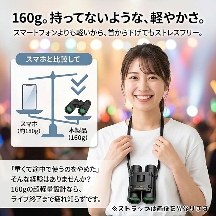 長時間のライブでも安定した視界で、推しの最高の瞬間を逃さず捉えます。