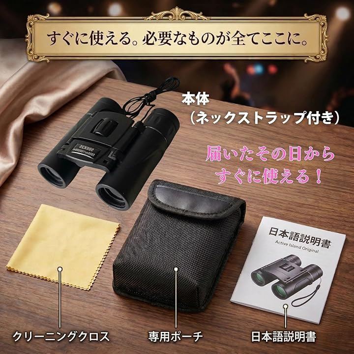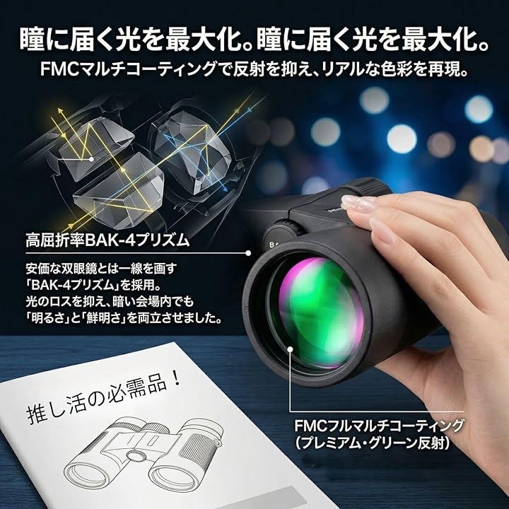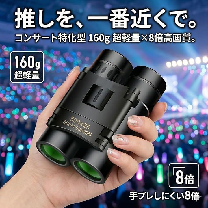 「コンサートに最適な黄金の8倍」 どんなに遠い席でも、推しの汗や表情まで鮮明に見える超軽量双眼鏡です。