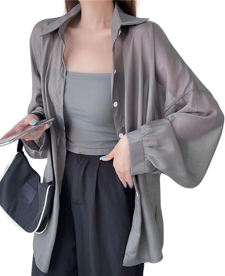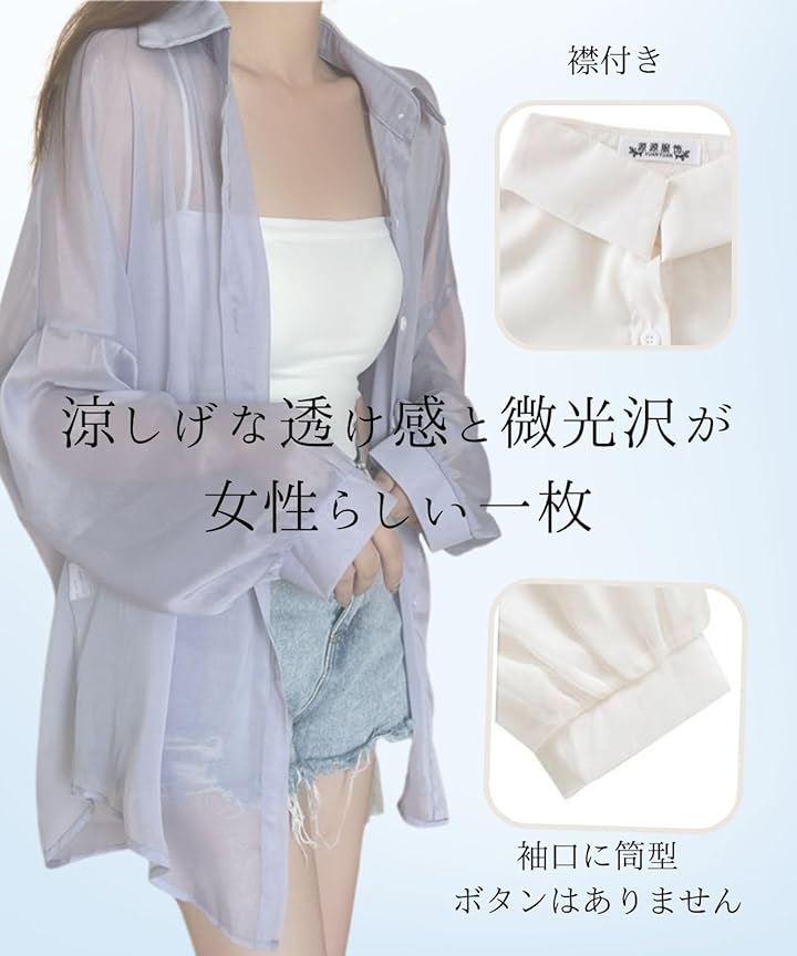シャーベットカラーが涼し気で春から夏にかけて使い勝手の良いシアーシャツ 涼しげな透け感と微光沢が女性らしい一枚です ドロップショルダーで抜け感があり、サラリと羽織れるシンプルデザイン 衿を抜いてラフな着こなしもおすすめ。