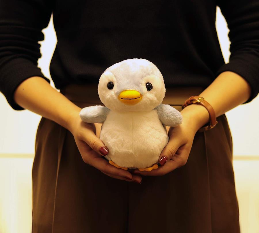ふわふわ、やさしい手触りのキュートなぬいぐるみ丸い体と黄色の口ばしが可愛いらしい、ペンギンのぬいぐるみ