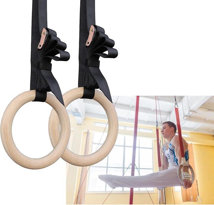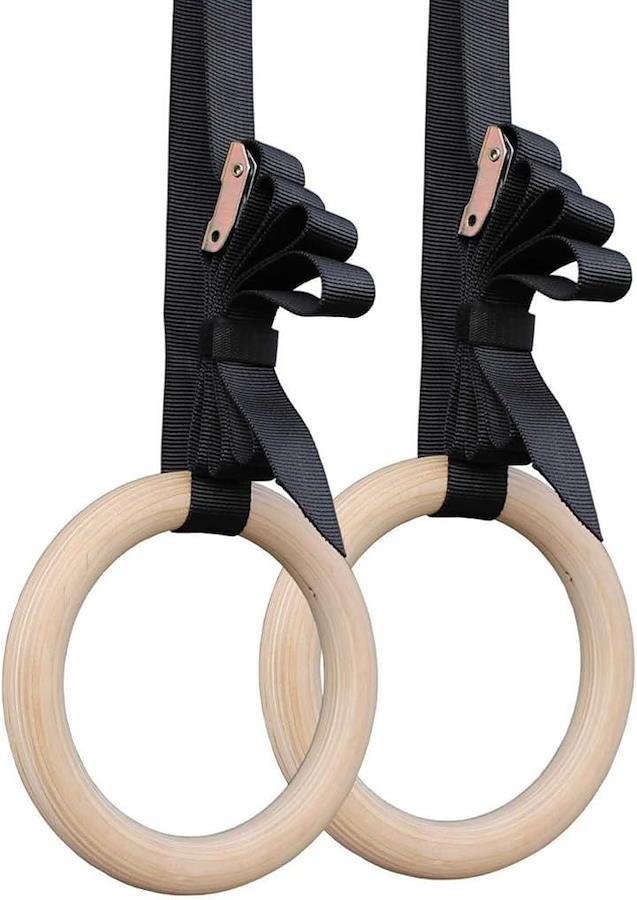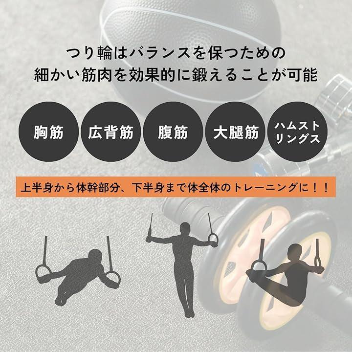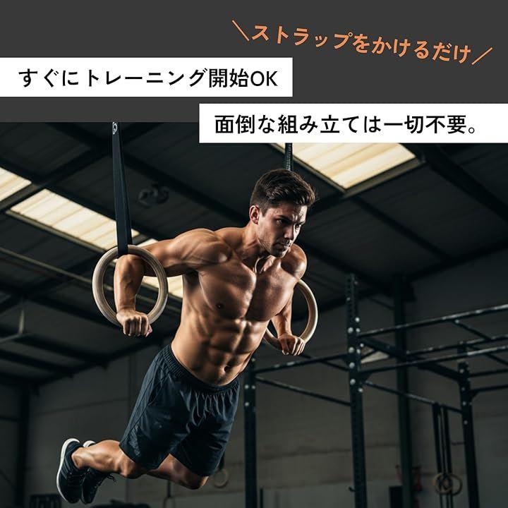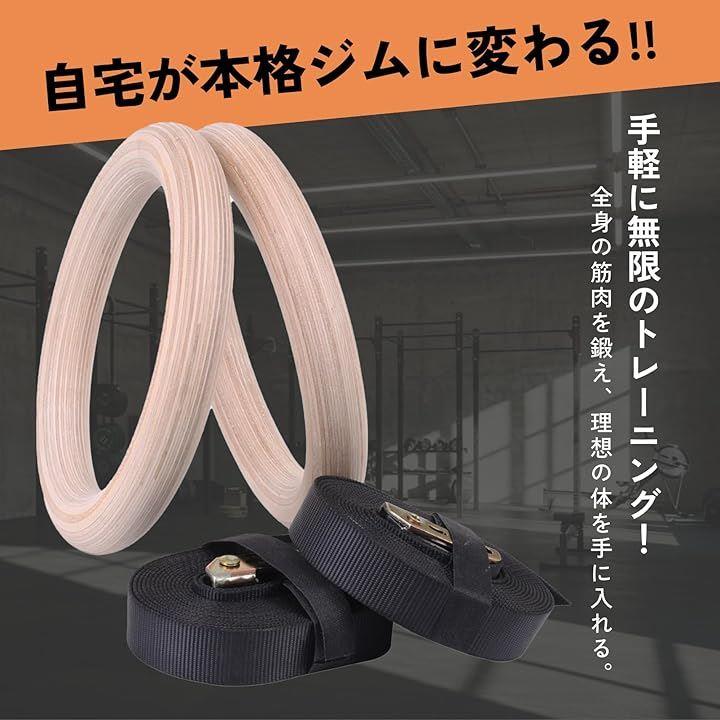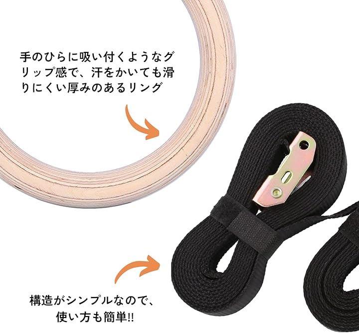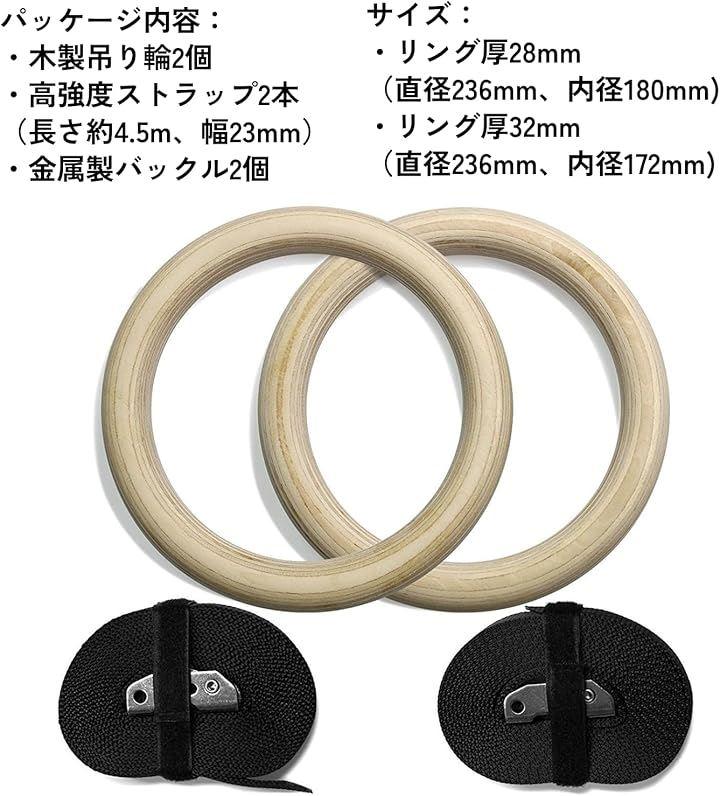 パッケージ内容: 木製吊り輪2個、高強度ストラップ2本(長さ約4.5m、幅23mm)、金属製バックル2個。