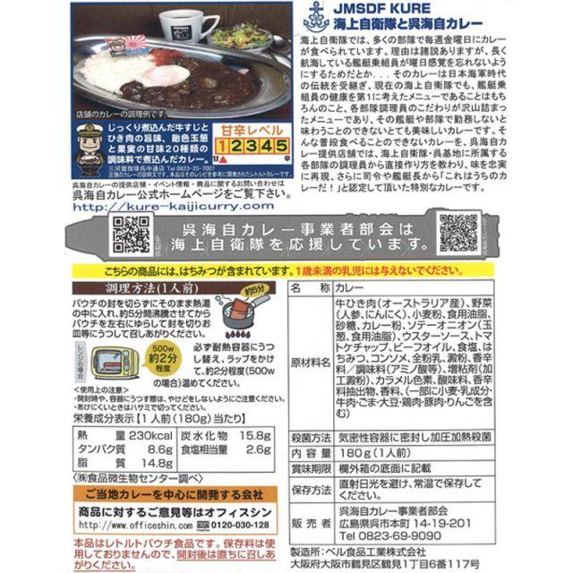 商品名:呉海自カレー( 掃海母艦ぶんご )海上自衛隊 カレー レトルト 非常食 自衛隊制作協力:海上自衛隊 呉地方総監部海上自衛隊呉基地・艦艇のカレーが味わえると人気の「呉海自カレー」が、家でも気軽に味わえるようレトルトパウチになって登場。海上自衛隊の艦艇で食べられているカレーと同じ味をいつでも楽しめます。掃海母艦ぶんごは、とろける牛すじとひき肉のカレー。とろけるほど煮込んだ牛すじとひき肉の旨味、そしてあめ色玉葱と果実の甘味20種類にもなる調味料でじっくり煮込んだ独特のコクと旨味が楽しめます。お土産としても人気です。【甘辛レベル 1】内容量:180g(1人前)