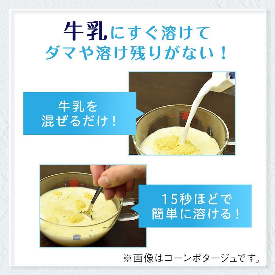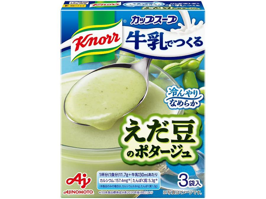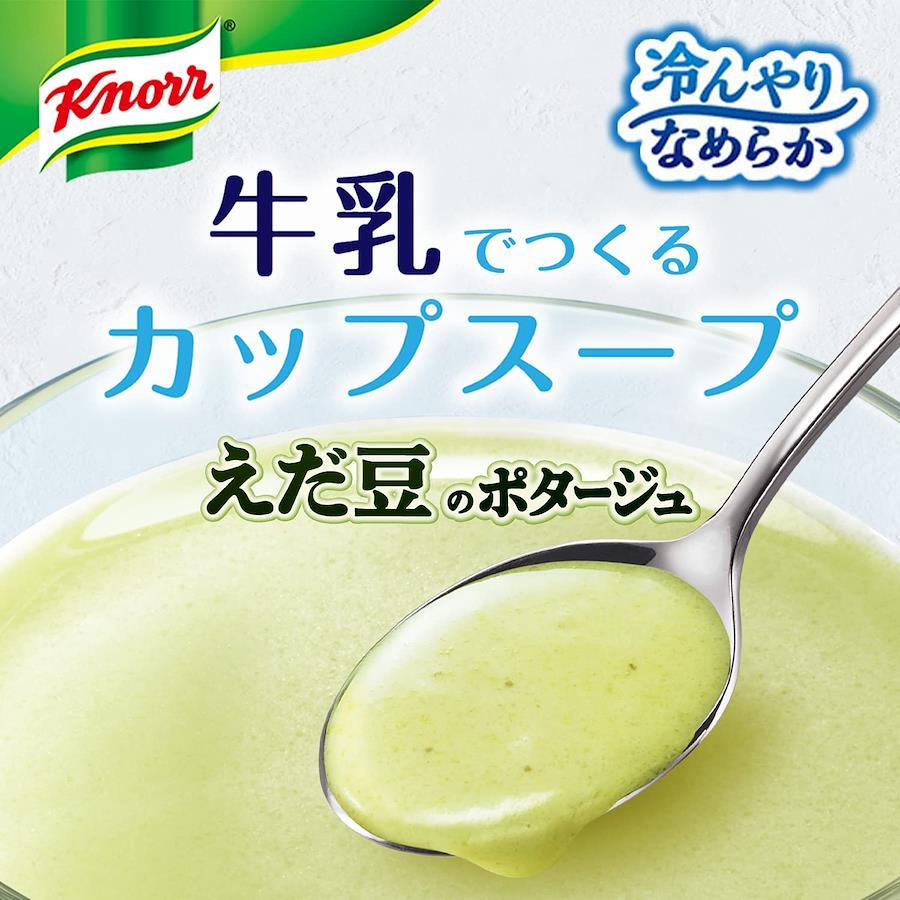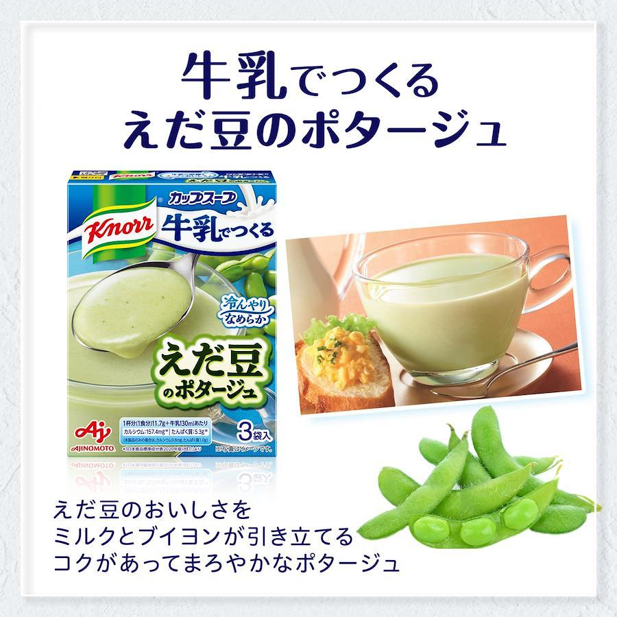 緑色鮮やかなえだ豆の香りと風味が溶け込んだコクがあってまろやかなポタージュが、牛乳で溶かして混ぜるだけで手軽に作れます。たんぱく質やカルシウムをたっぷり含む牛乳の栄養を野菜が溶け込んだスープでおいしく摂ることができます。冷たい牛乳にも溶けるので、夏場の暑い時期には冷製スープとしてもお楽しみいただけます。