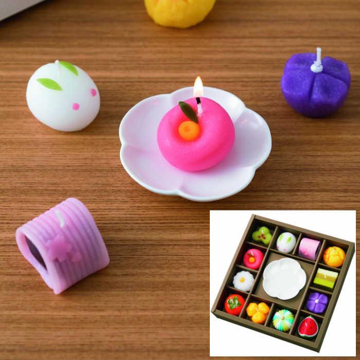 季節の和菓子ローソク×12(1月:松、2月:雪うさぎ、3月:桜餡巻き、4月:黄身しぐれ、5月:新緑の棹もの、6月:紫陽花、7月:西瓜、8月:手毬、9月:栗かのこ、10月:柿、11月:菊、12月:椿)、陶製皿×1