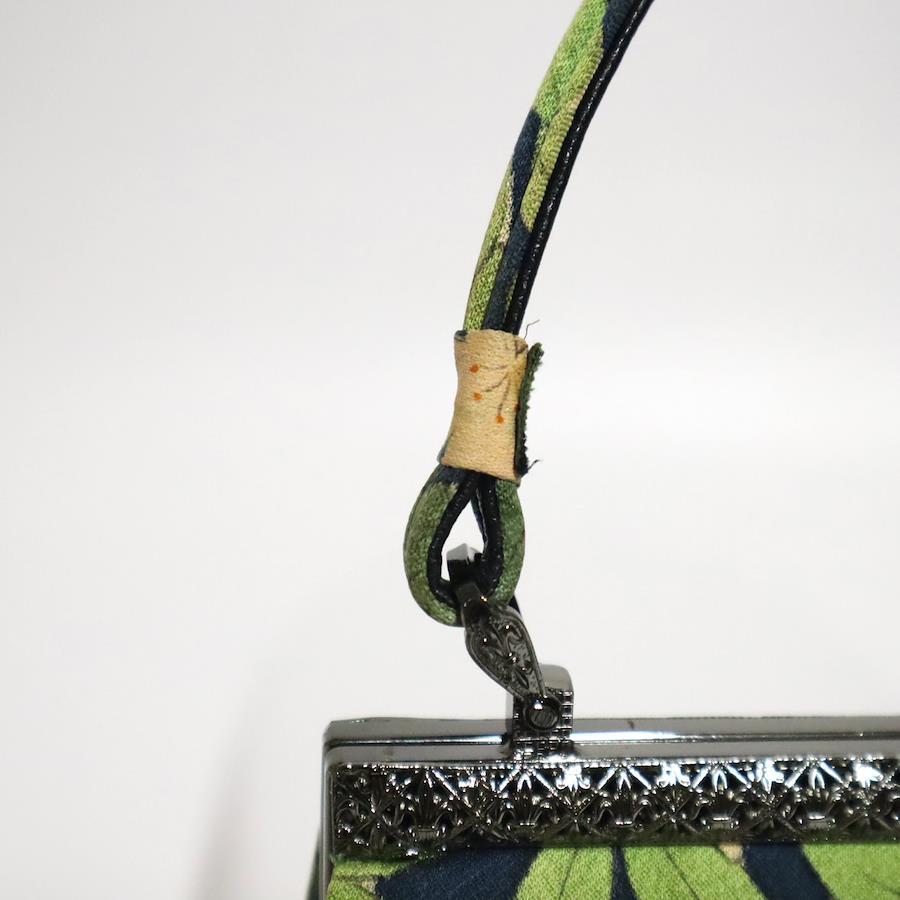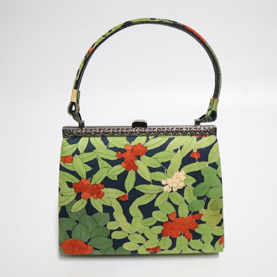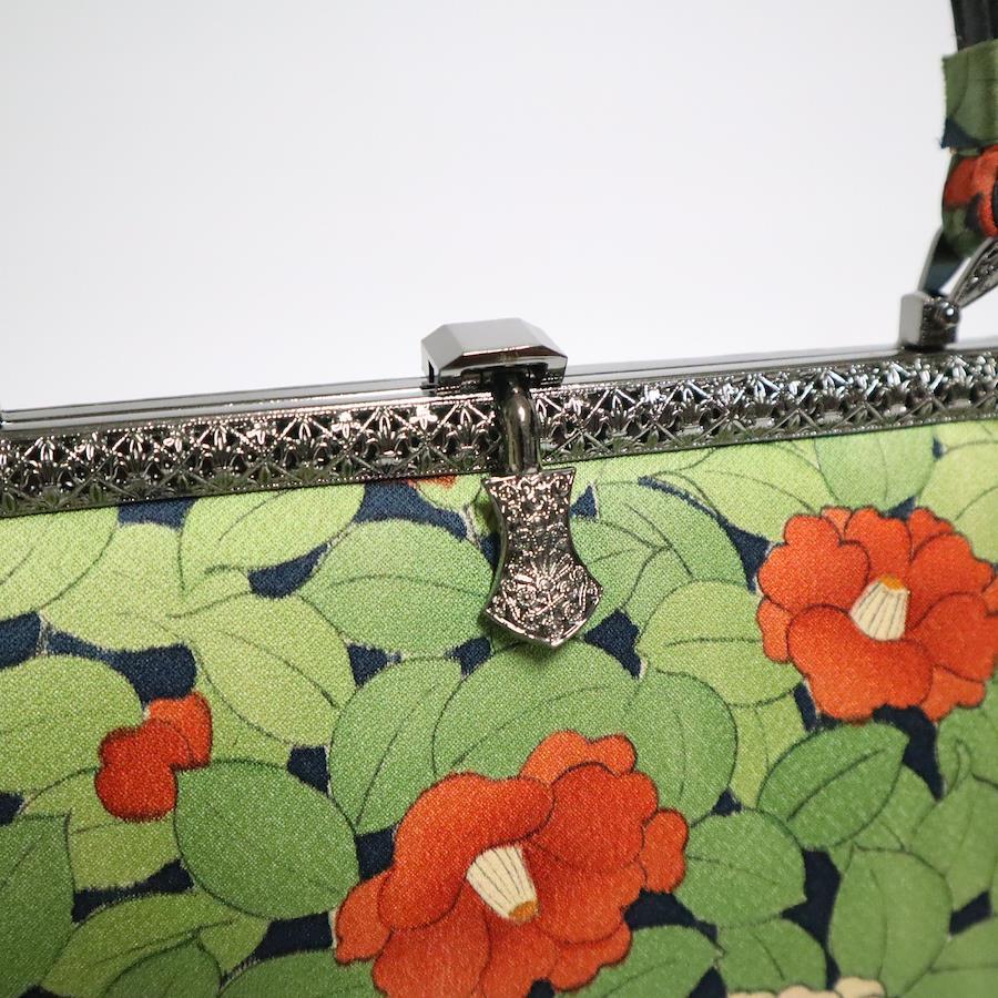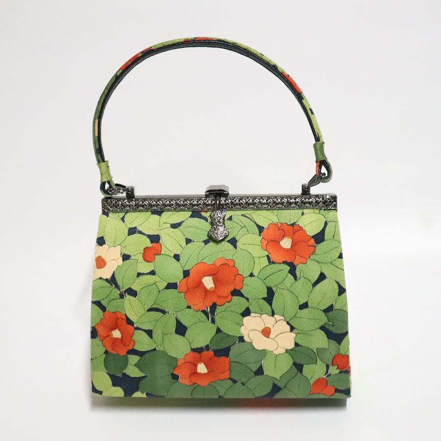 【詳細】■ 商品名・モデル:椿柄 和装バッグ(がま口風フレーム)■ ブランド:無銘■ カラー:グリーン系(椿柄)■ サイズ:横幅 約19cm/マチ 約5〜6cm■ 状態:- 傷・汚れ:金具に微細なスレあり。持ち手付け根にやや使用感あり。- 使用感:リユース品のため、購入時期や使用回数は不明です。- 動作確認:開閉問題なし■ 付属品:小さな鏡(おまけ)