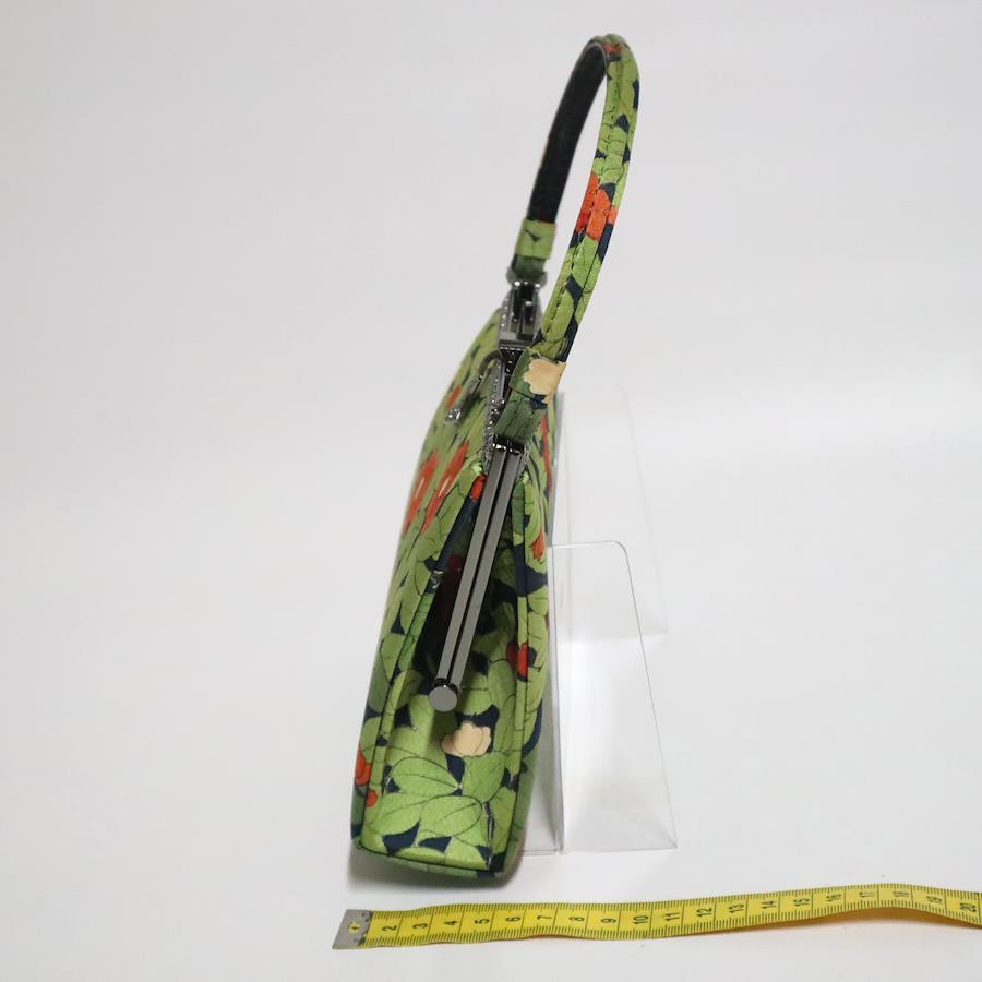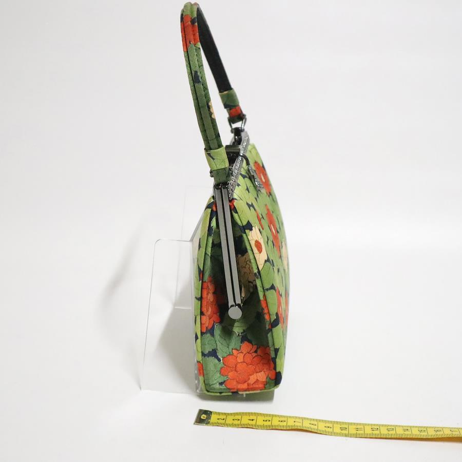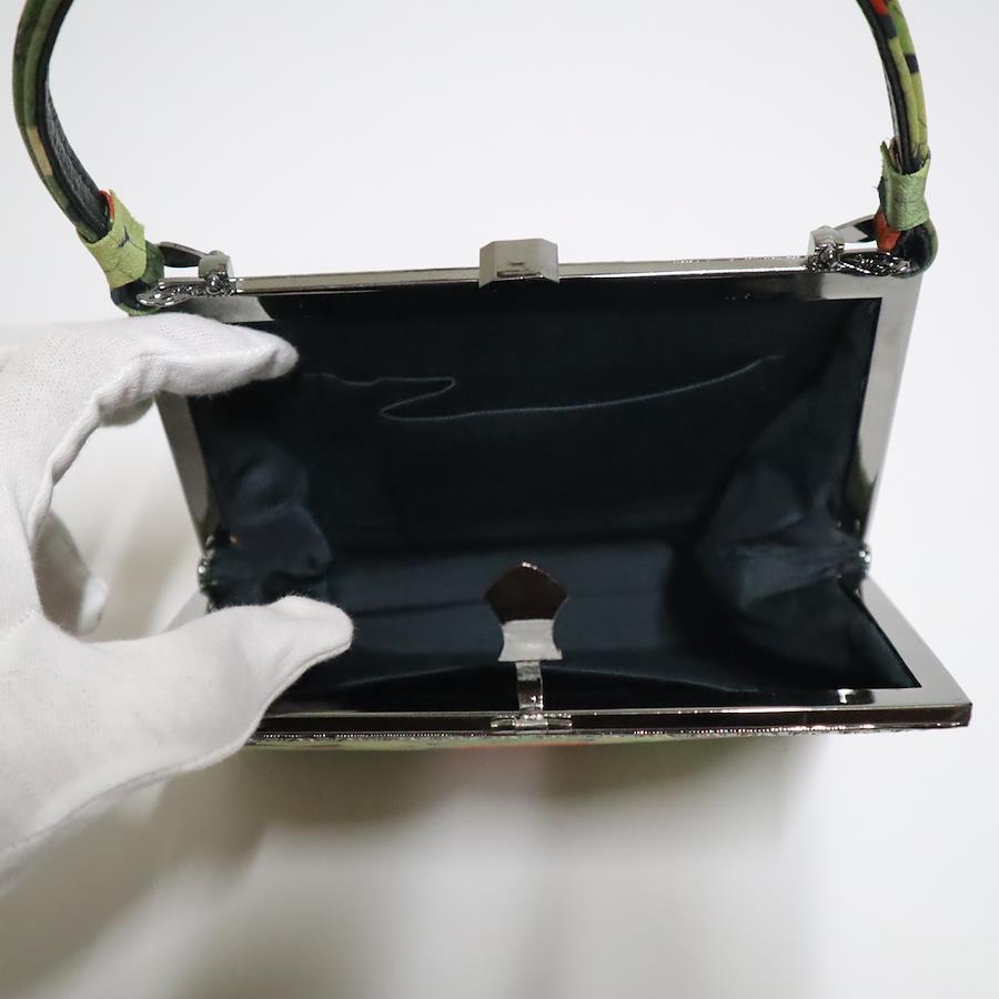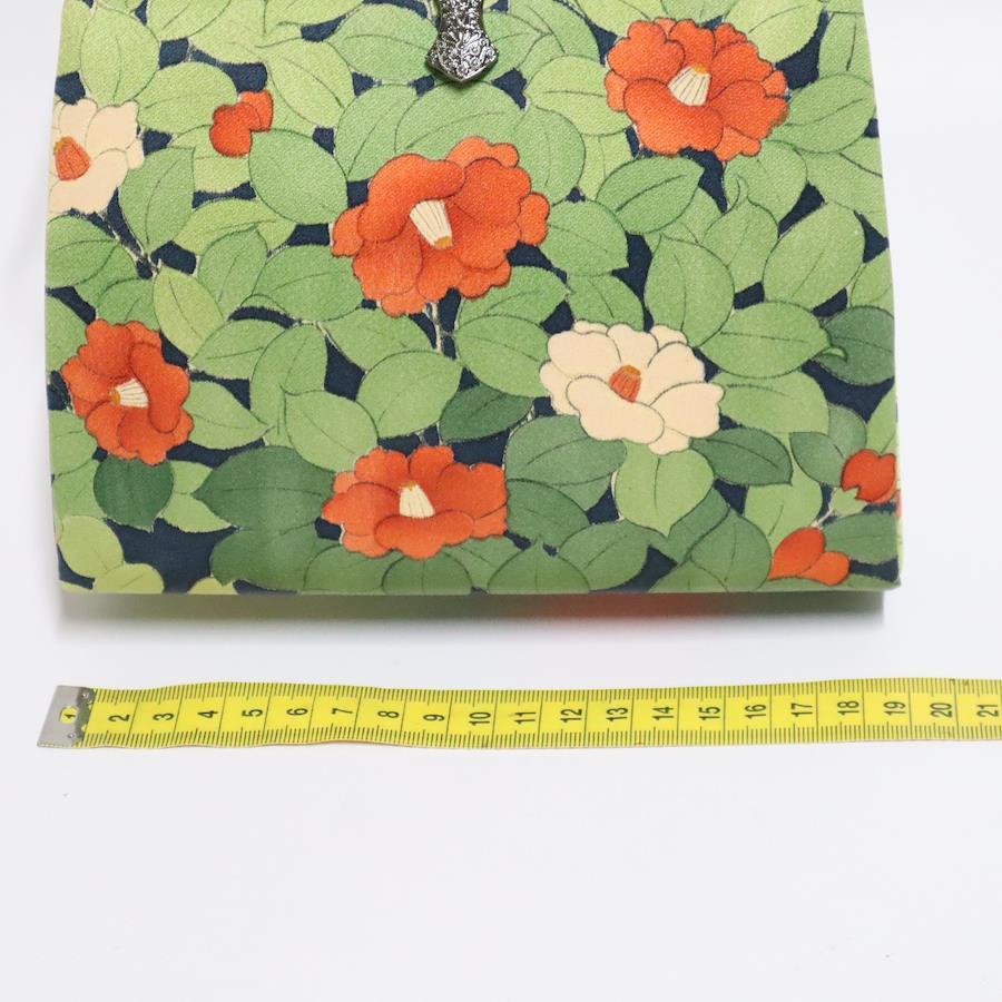 【詳細】■ 商品名・モデル:椿柄 和装バッグ(がま口風フレーム)■ ブランド:無銘■ カラー:グリーン系(椿柄)■ サイズ:横幅 約19cm/マチ 約5〜6cm■ 状態:- 傷・汚れ:金具に微細なスレあり。持ち手付け根にやや使用感あり。- 使用感:リユース品のため、購入時期や使用回数は不明です。- 動作確認:開閉問題なし■ 付属品:小さな鏡(おまけ)