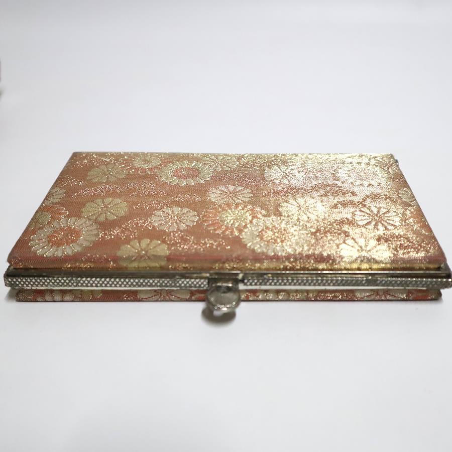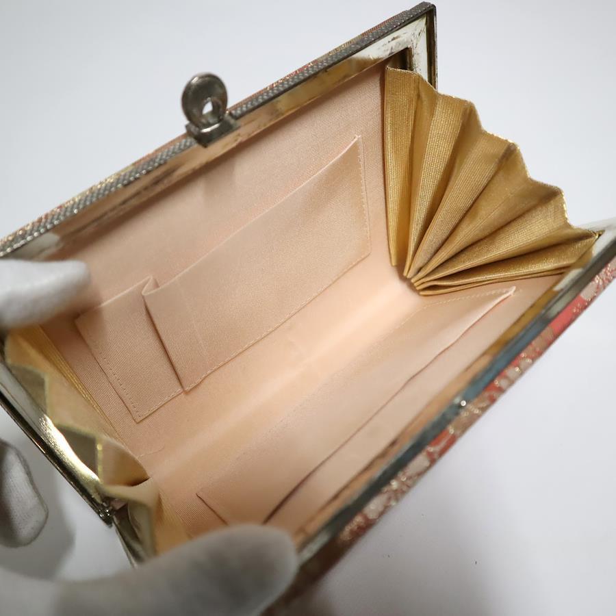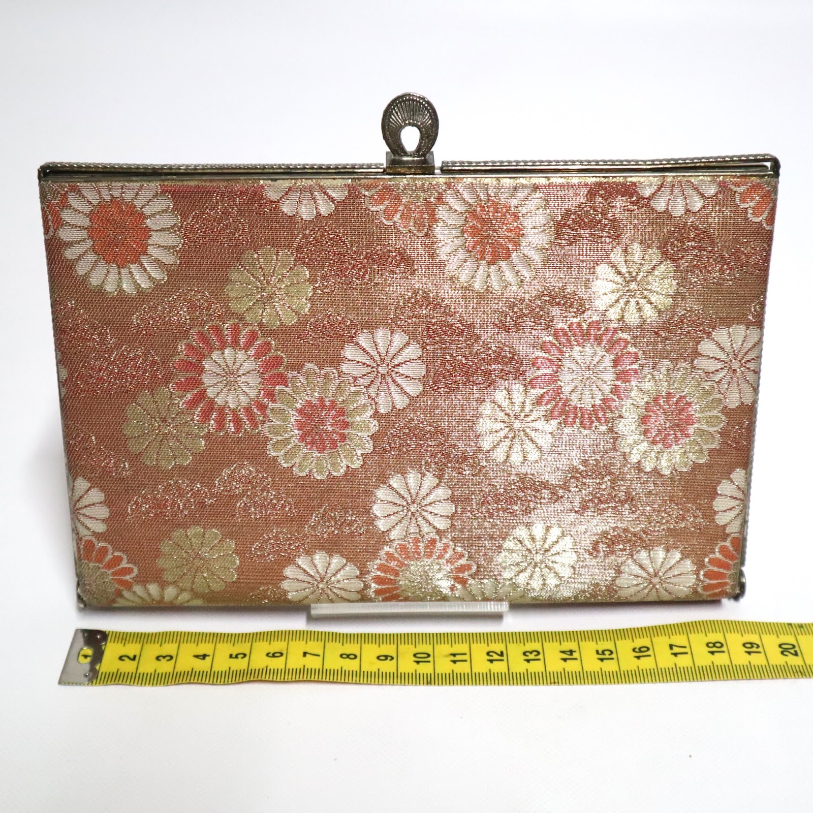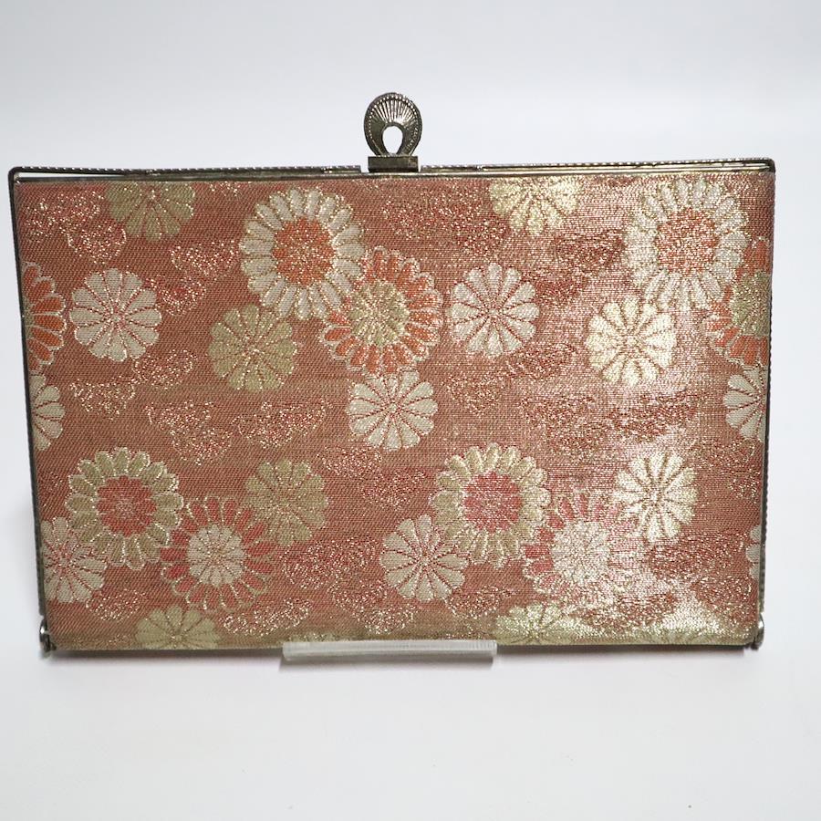 【詳細】■ 商品名・モデル:和装用 金襴バッグ(クラッチ・がま口風)■ カラー:金・桃系(菊文様)■ サイズ:横約19.5cm × 高さ約13cm■ 状態:- 傷・汚れ:金具部分に腐食・変色あり。生地部分や内側は比較的きれいです。- 使用感:リユース品のため、購入時期・使用回数は不明です。- 動作確認:開閉は問題ありません。■ 付属品:元箱(経年劣化あり)
