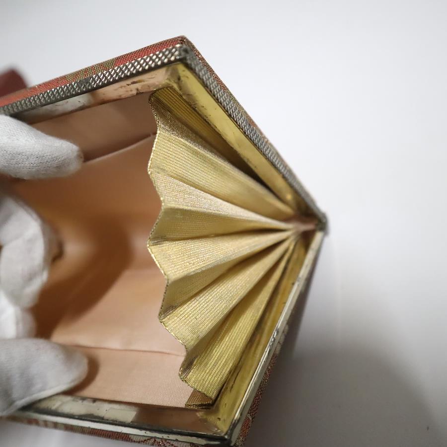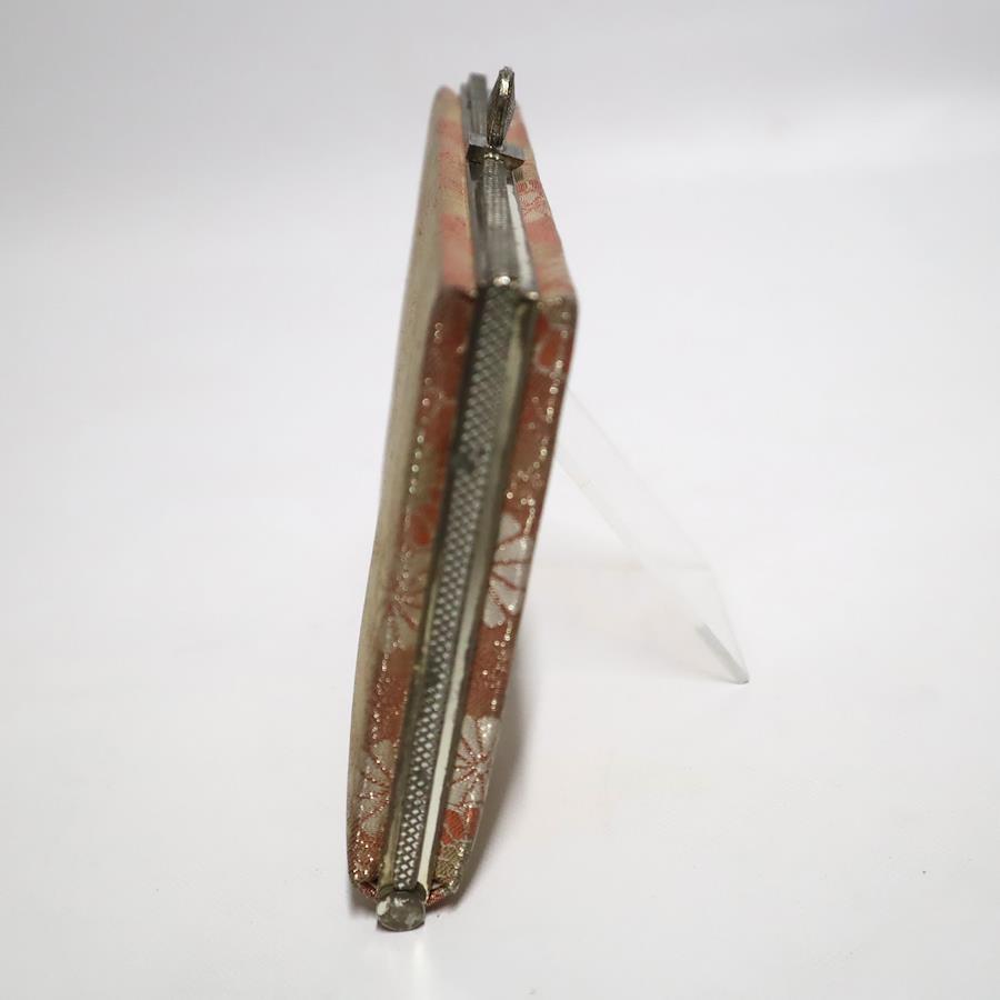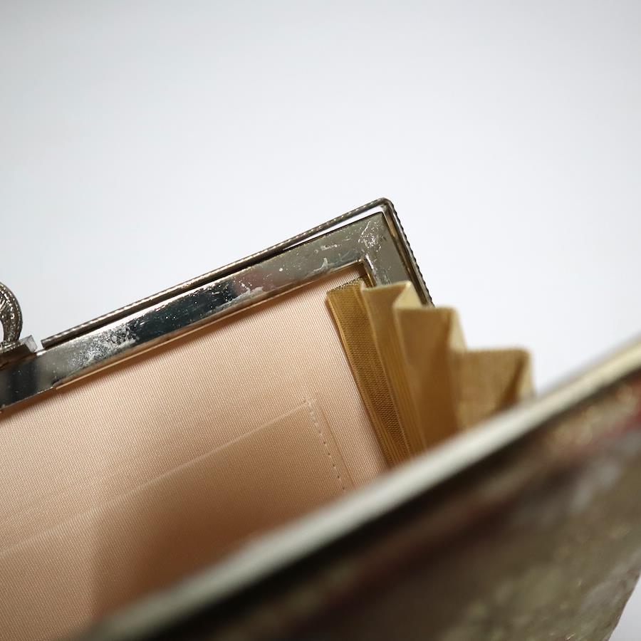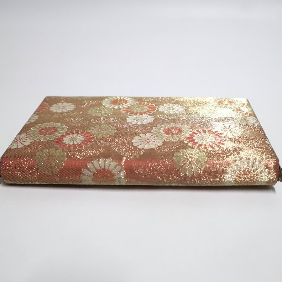 【詳細】■ 商品名・モデル:和装用 金襴バッグ(クラッチ・がま口風)■ カラー:金・桃系(菊文様)■ サイズ:横約19.5cm × 高さ約13cm■ 状態:- 傷・汚れ:金具部分に腐食・変色あり。生地部分や内側は比較的きれいです。- 使用感:リユース品のため、購入時期・使用回数は不明です。- 動作確認:開閉は問題ありません。■ 付属品:元箱(経年劣化あり)