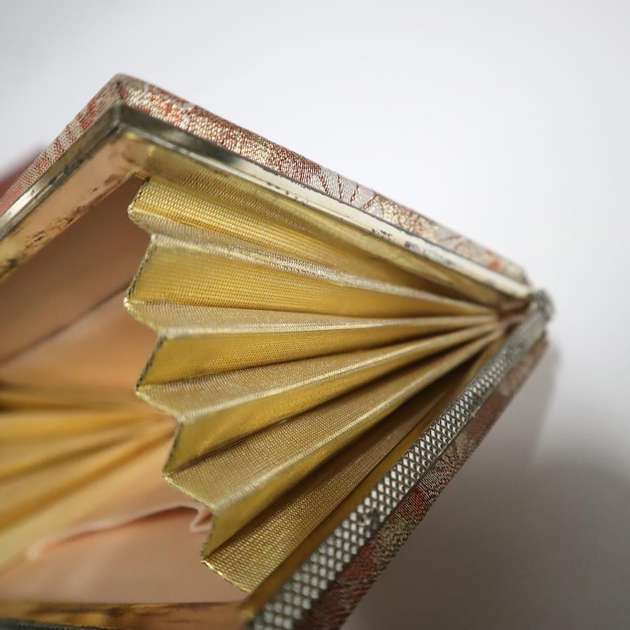 和装フォーマルに上品に映える、金襴織(錦織)の美しい和装バッグです。菊文様が華やかで、留袖・訪問着・付け下げなど幅広い装いに合わせていただけます。蛇腹マチ付きで見た目以上の収納力があり、実用性も十分。結婚式やお茶会などフォーマルな場面におすすめです。