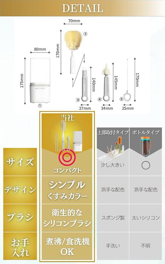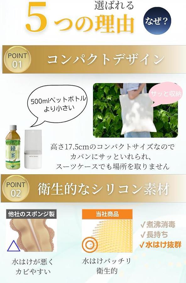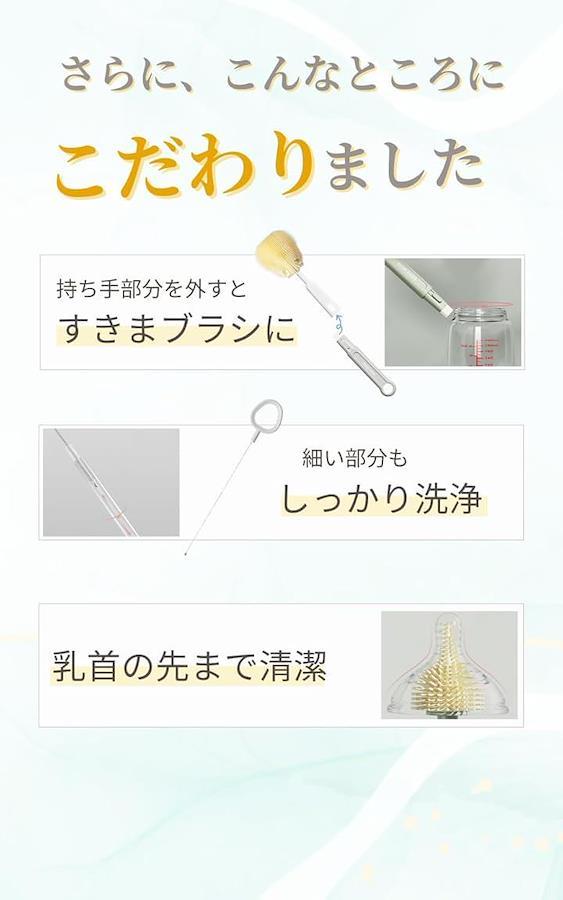 「柔らかいシリコン素材で哺乳瓶を丁寧に洗浄」 大切な哺乳瓶や水筒の表面を傷つけないように設計された柔軟なシリコン素材を使用。