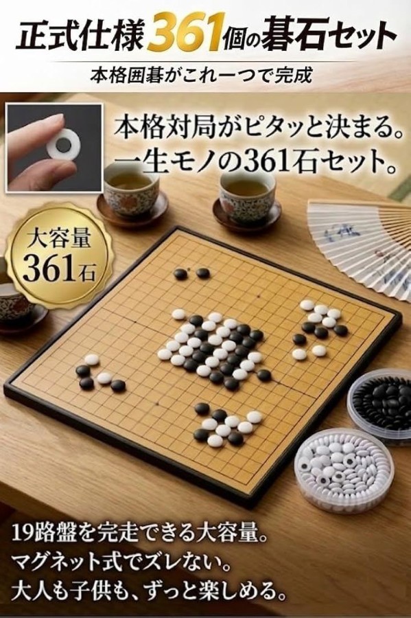 「届いてすぐに盤上の悦びを」「黒181個、白180個の計361個の碁石」と専用の保管ケースをすべて同梱。