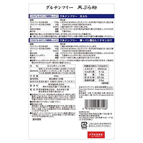 【グルテンフリー認証】7大アレルゲン不使用の玄米粉を使ったグルテンフリーシリーズです。グルテンフリー認証を取得しています。(認証機関:GFCO)【専用工場で製造】小麦を含めた食品7大アレルゲン(小麦・そば・卵・乳・落花生・えび・かに)の生産ラインへの持ち込みを禁止した厳格な品質管理体制の米粉専用工場で製造しています。【グルテンフリー天ぷら粉】小麦を使用せずサクサク仕上がる天ぷら粉です。【原材料】米粉(うるち米(九州産))、玄米粉(うるち米(九州産))、とうもろこし粉、でん粉/加工でん粉、膨張剤、増粘剤(加工でん粉)乳化剤【内容量】200g×3袋セット【重要】メーカーによる商品リニューアルに伴いパッケージ(内容量も含む)変更が行われた場合、新パッケージでお届け致します事ご了承願います。