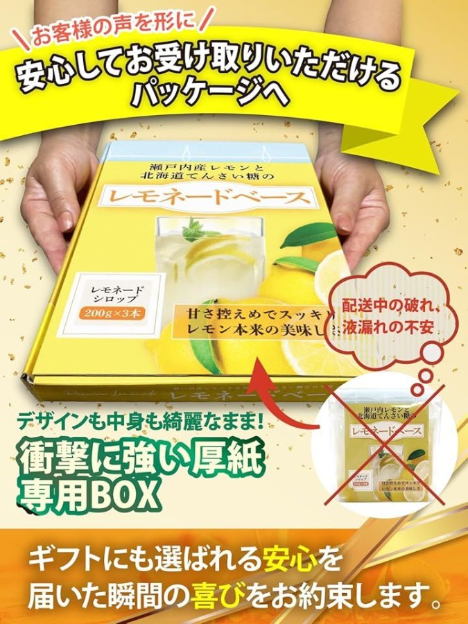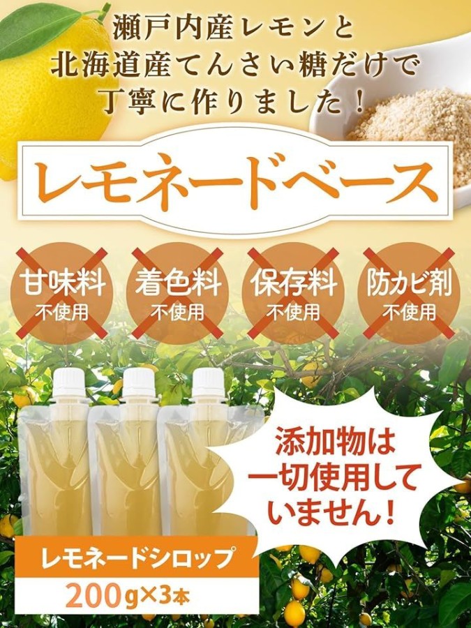 名称:レモネードシロップ原材料:甜菜糖(甜菜(北海道産))、レモン(広島県産)内容量:200gx3本賞味期限:パッケージに記載保存方法:直射日光を避け冷暗所にて保存してください。