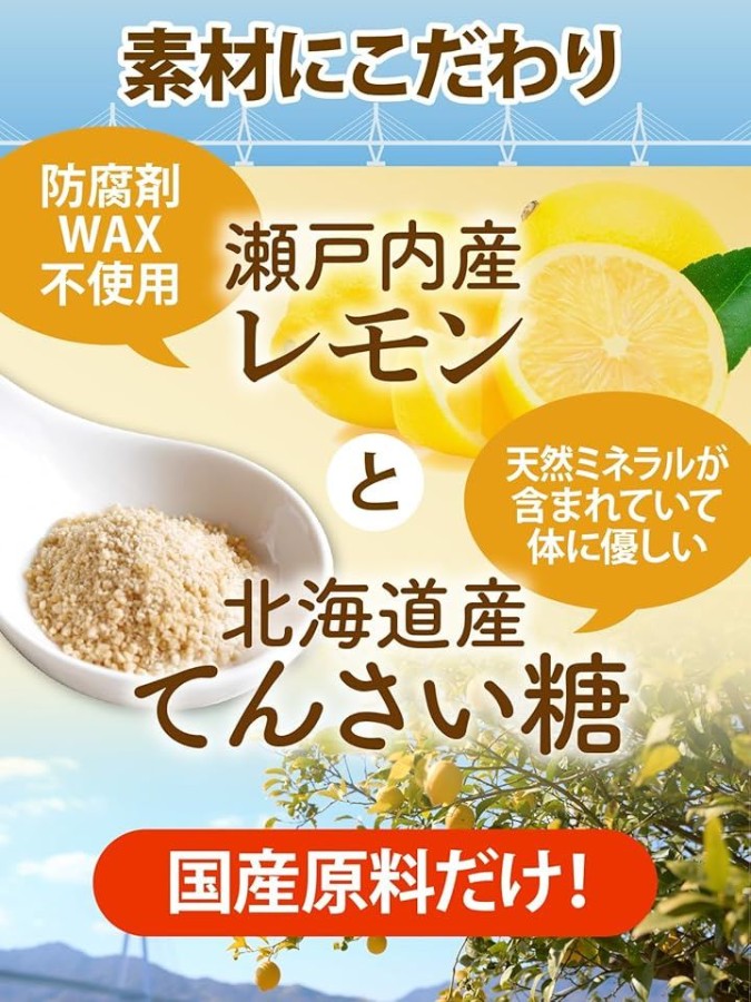 原産地: 広島県、北海道 原材料: レモン(広島県産)、てんさい糖(北海道産)