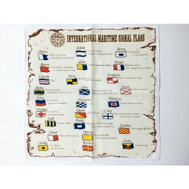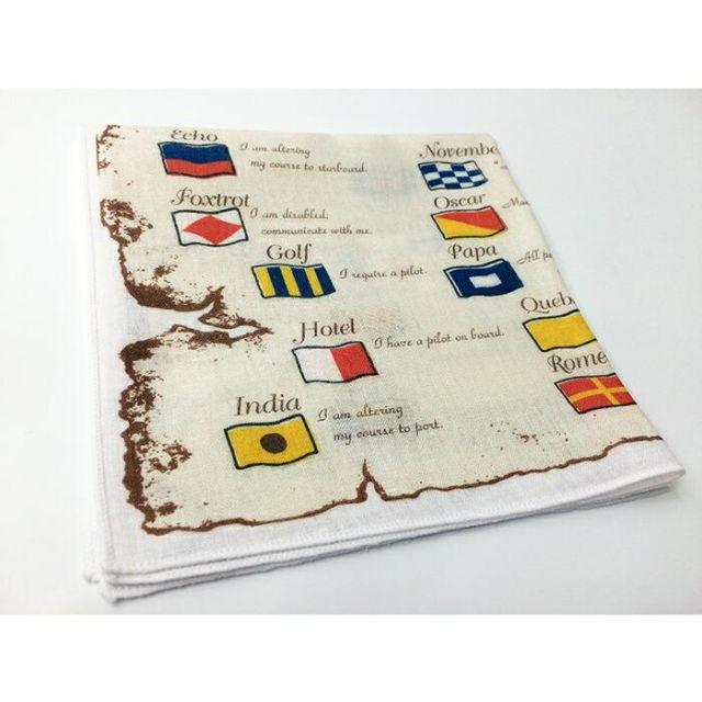 商品名:国際信号機 グッズ 【 手ぬぐいハンカチ(国際信号旗[古地図柄])シグナルフラッグ 】綿 綿100% コットン ハンカチ 二重ガーゼ 簡易マスク マスク国際信号旗(シグナルフラッグ)柄の手ぬぐいハンカチ。●大きさ:約34cm×36cm● 素材:綿100%■■■■国際信号旗は?■■■■船舶の通信のため、世界共通で使われる旗のこと。アルファベットの文字旗26枚、数字旗10枚、代表旗3枚、回答旗1枚の計40旗から構成されています。1旗ずつに意味があり、2旗、3旗の組み合わせによって、多くの意味を表すことができます。国際信号旗を掲げておけば、その船の状況を周りの船舶に知らせながら航海・停泊することができます。