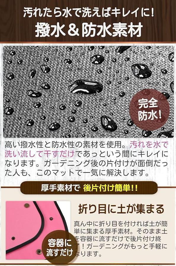 「商品特徴」 洗い流せる撥水加工:防水加工で汚れを洗えて便利 土がこぼれ落ちない:4つ角が折れて土が飛び散りません コンパクトに収納:折り畳めるので収納もラクラク。
