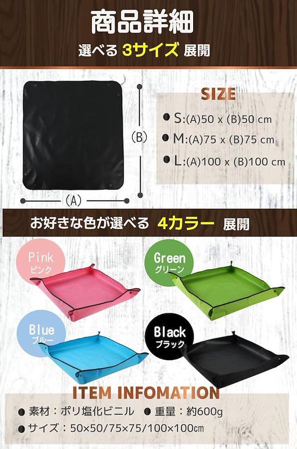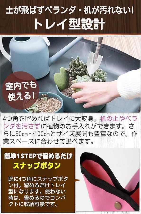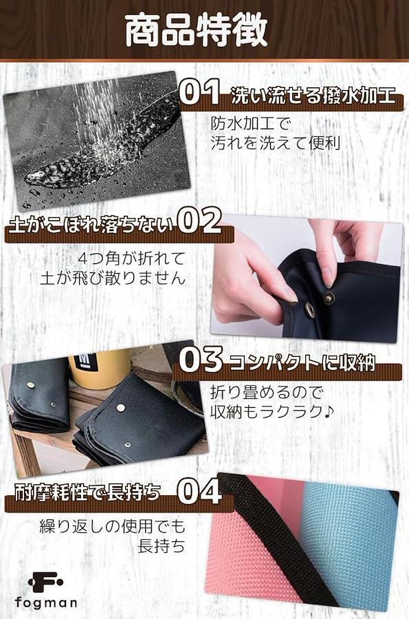「商品特徴」 洗い流せる撥水加工:防水加工で汚れを洗えて便利 土がこぼれ落ちない:4つ角が折れて土が飛び散りません コンパクトに収納:折り畳めるので収納もラクラク。
