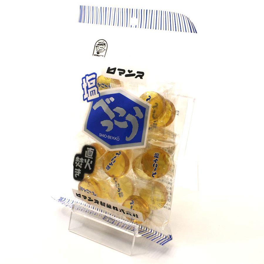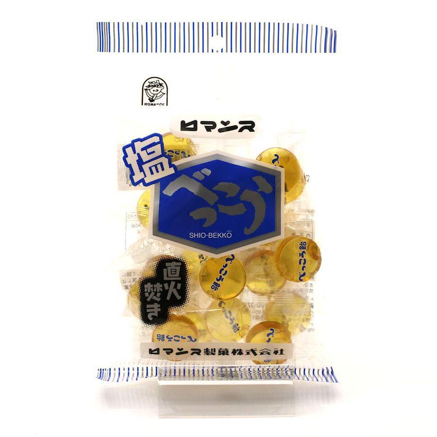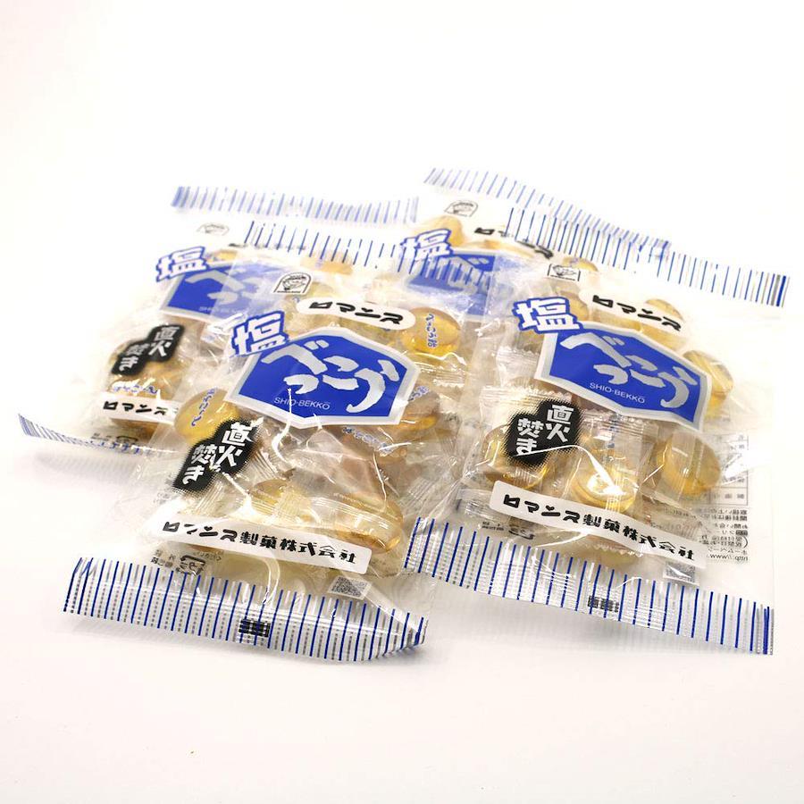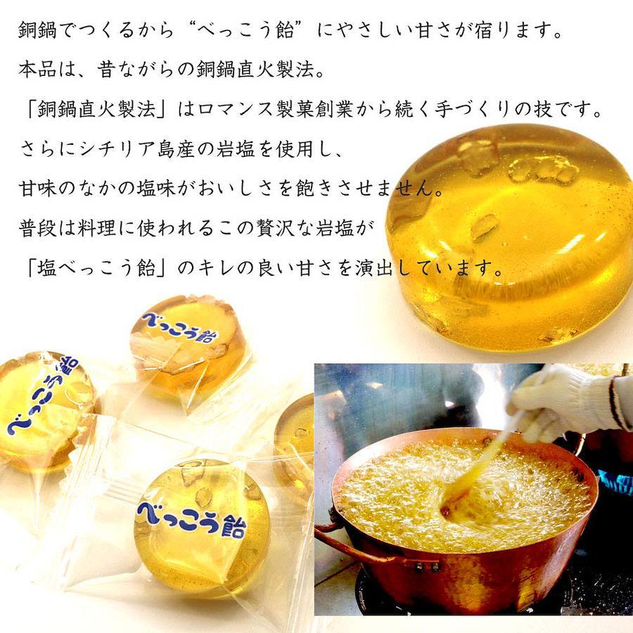 岩塩の粒はおいしさのアクセント ロマンス製菓 塩べっこう飴 銅鍋でつくるから“べっこう飴”にやさしい甘さが宿ります。 本品は、昔ながらの銅鍋直火製法。「銅鍋直火製法」はロマンス製菓創業から続く手づくりの技です。 さらにシチリア島産の岩塩を使用し、甘味のなかの塩味がおいしさを飽きさせません。 普段は料理に使われるこの贅沢な岩塩が「塩べっこう飴」のキレの良い甘さを演出しています。