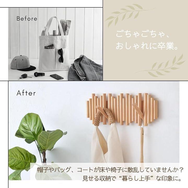 木目調の上品なデザインがどんなインテリアにも自然になじみ、見せる収納として空間を美しく演出する多機能ウォールフックです。