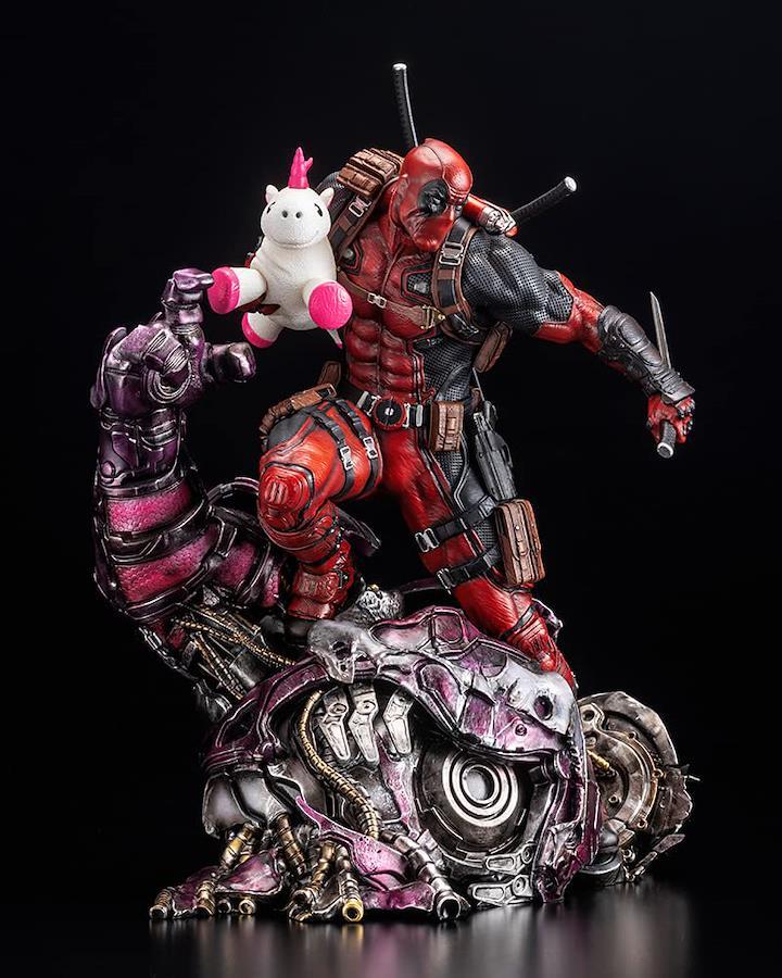 ケーブルの長年の盟友であり、今や不動の人気ミュータントの一員となったデッドプールを1/6スケールのなかに圧倒的な情報量を持った密度で立体化。二本の刀を隙なく構え、抵抗を続けるニムロッドのドローンを踏みつけ、勝負を制し堂々とキメる様を最大36cmを超えるビッグサイズで躍動感たっぷりに彫刻しました。
