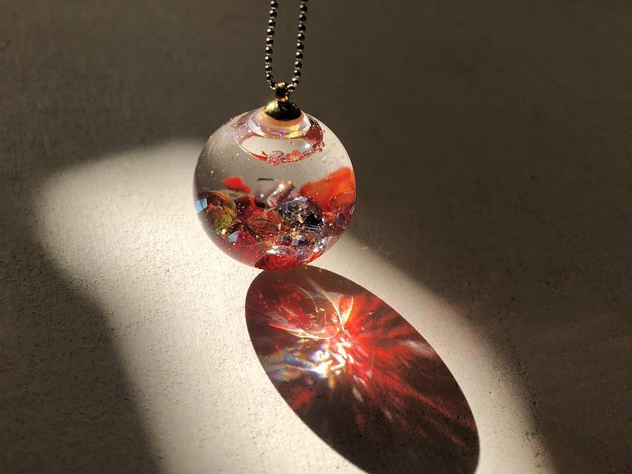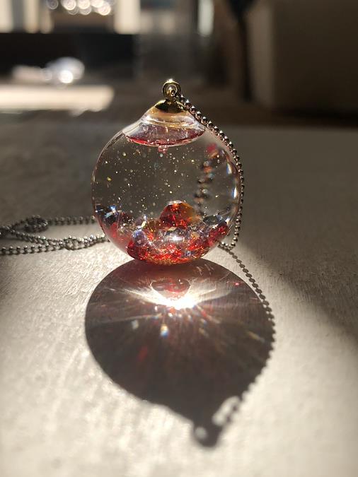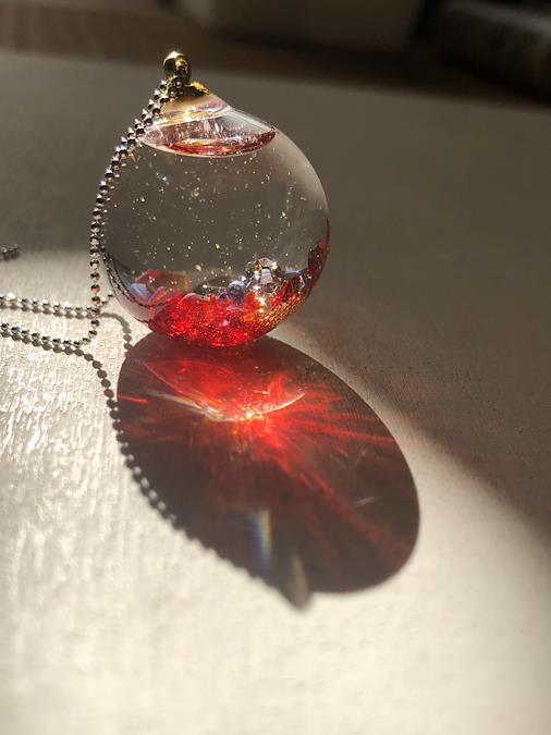 夕焼けのように真っ赤なガラスドーム。振ると中の色の重なりが変わり、紫や黄色、青などいろんな色が赤の隙間から出てきます。ガラスドームの大きさ 2.5cmチェーン長さ 53センチほど