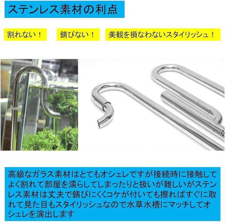 「ステンレス製の利点」割れない。錆びない。美観を損なわないのでスタイリッシュ。高級なガラス素材はとてもオシェレですが接続時に接触してよく割れて部屋を濡らしてしまったりと扱いが難しいがステンレス素材は丈夫で錆びにくくコケが付いても擦ればすぐに取れて見た目もスタイリッシュなので水草水槽にマッチしてオシェレを演出します