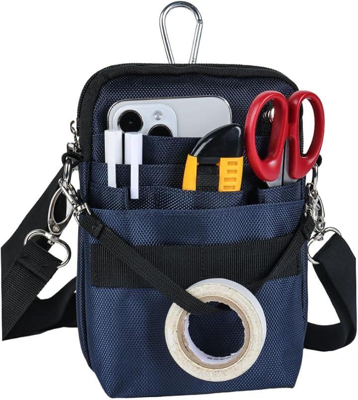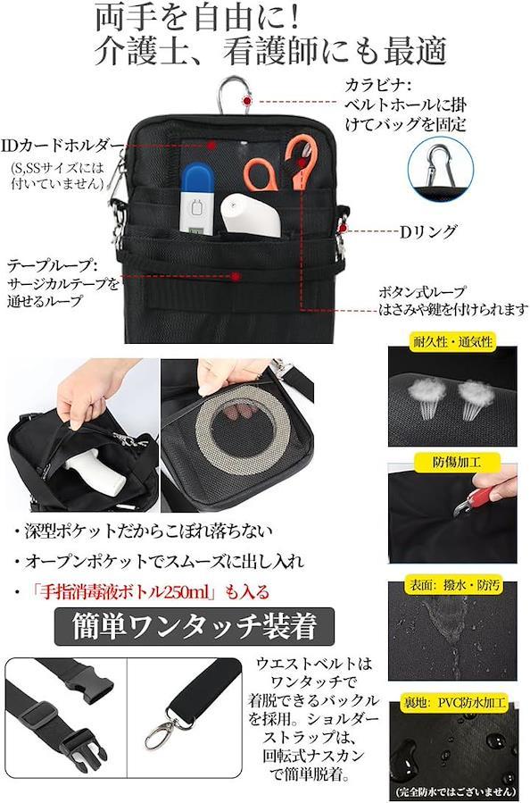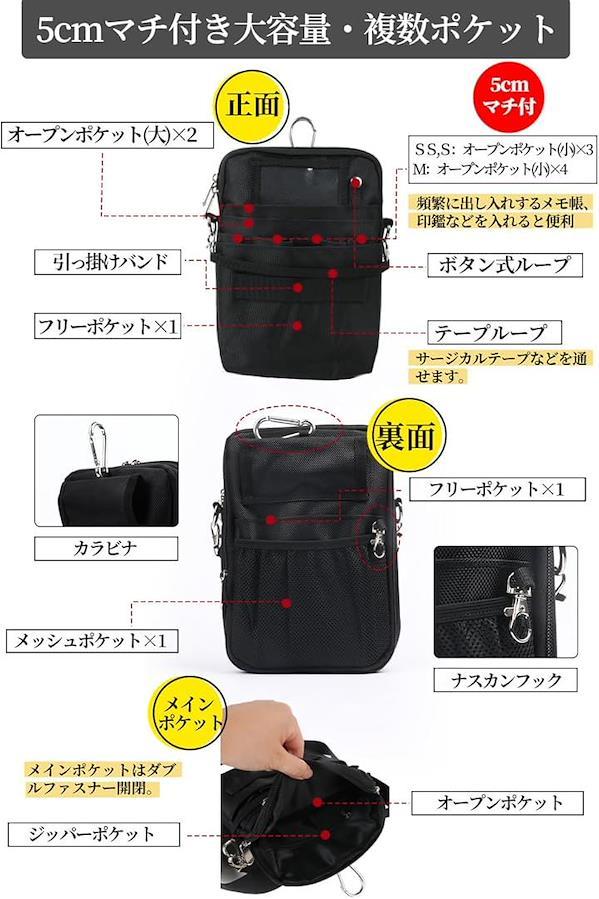 「ダブルファスナー・縫製強化仕様 」メインポケットのファスナーをダブルファスナーにし、ベルトループ部分の縫製も2重縫製で強化。 「大小複数ポケットで仕分け」メモ帳、スマホ、A6・B6ノートなどが入る大きめポケット、貴重品収納に便利な内部ファスナーポケット、ペンやハサミ等が入る細長ポケット、小物収納にぴったりのフロントポケットなど、大小ポケットの組み合わせで使いやすさ抜群。ワークポーチやナースオーガナイザーとしても便利です。