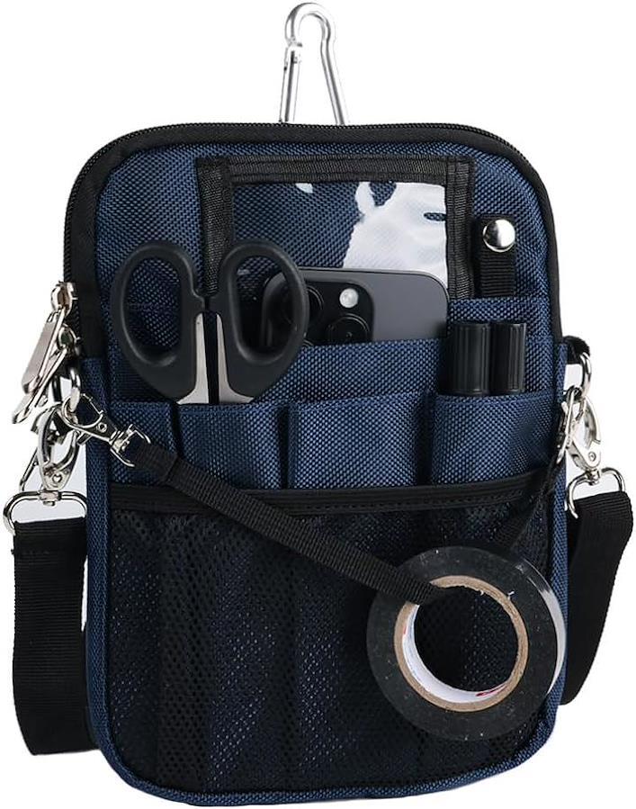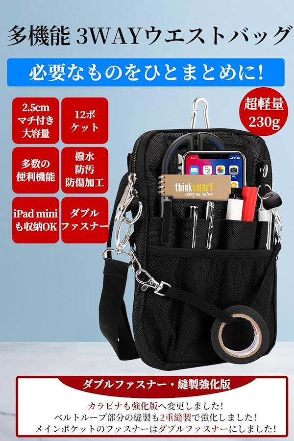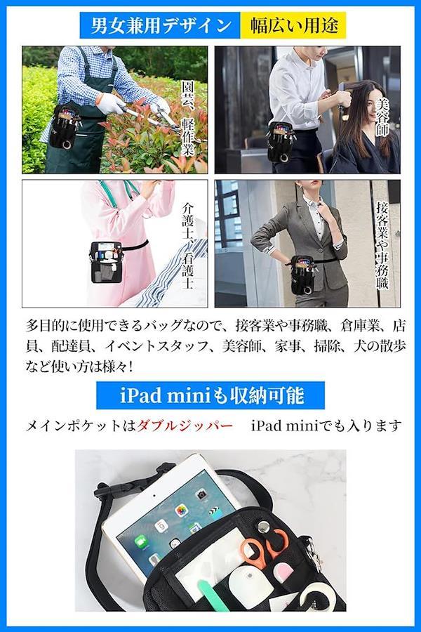 *マチ2.5cm大容量、12ポケットと多数の機能を兼ね備えた仕事用ウエストポーチ。 v「ダブルファスナー・縫製強化仕様 」お客様からご要望により、メインポケットのファスナーをダブルファスナーにしました。カラビナも強度UP版に変更し、ベルトループ部分の縫製も2重縫製で強化。 v「12個の大小複数ポケット」iPad mini、A6・B6ノートなどが入る大きめのポケット、貴重品や鍵が入れられる内部ファスナー付きポケット、ペンやドライバーなどの入る細長いポケット、小物収納にぴったりのメッシュポケットなど大小複数ポケットを装備。「消毒液ボトル250ml」も入るので、ナースオーガナイザー・ワークポーチとしても便利です。