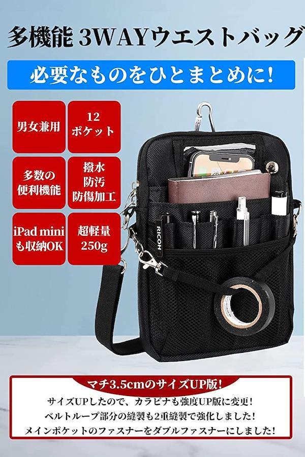 v「商品仕様」 商品内容:ウエストバッグ、ショルダーストラップ、ウエストベルト、テープホルダー、カラビナ サイズ:高さ24x幅18x奥行(マチ)3.5cm 重量:250g 素材:1680Dポリエステル(オックスフォード織) (胸ポケット用ペンケースは付属していません。
