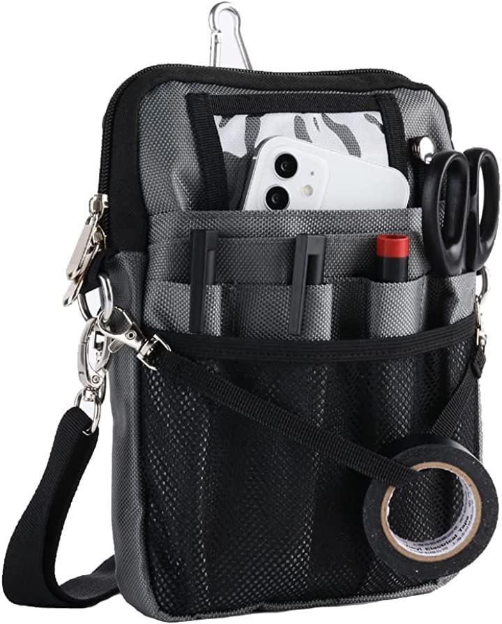v「便利な機能が多数」IDカードホルダー、サージカルテープを通せるループ、時計や鍵をつけられるDカンやボタン式ループ、ベルトループに掛けバッグの位置を固定できるカラビナ付き。