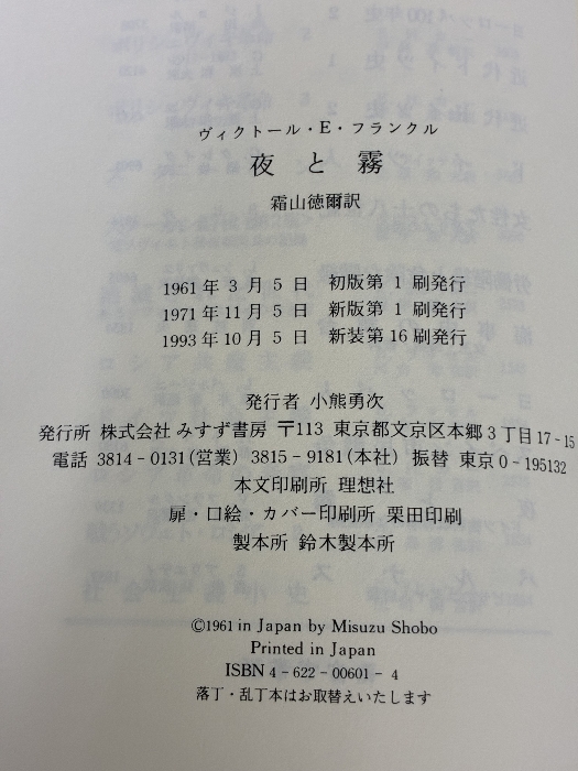 ■商品詳細■ 商品名・夜と霧――ドイツ強制収容所の体験記録 みすず書房 V.E.フランクル/ ■商品状態■表紙にスレ、ヤケ、ヨレ、傷み、天地小口にスレ、ヤケ、シミ、本にスレ、ヤケ、シミ、があります。本を読むことに支障はございません。※注意事項※■毎商品チェック後出品しておりますが、中古品ということもあり、多少の書き込み等のチェック漏れがあった際はご容赦下さい。■付録等の付属品がある商品の場合、記載されていない物は『付属なし』とご理解下さい。■併売販売をしているため、在庫切れの場合はキャンセルとなります。予めご了承ください。