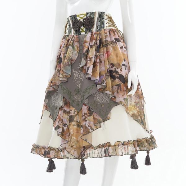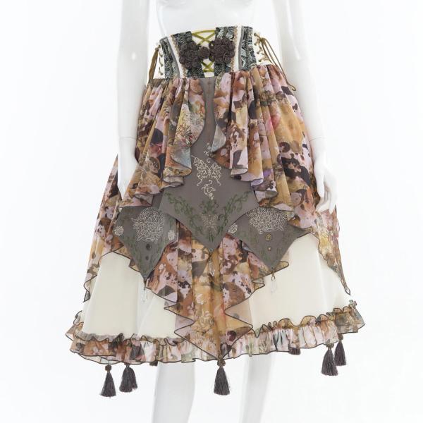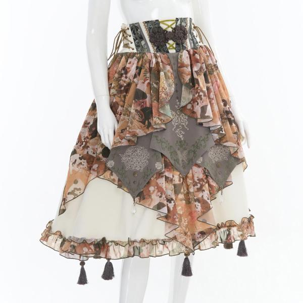 着物の打ち合わせや帯を思わせる切り替えを、変形フレアに落とし込んだスカート。