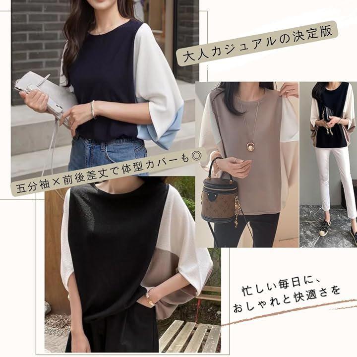 「五分袖x前後差丈で体型カバー」ゆったりドルマンスリーブと、絶妙な丈感で二の腕やお腹まわりもふんわりカバー。