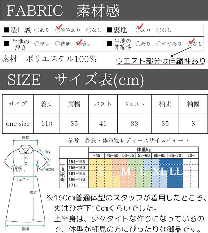 「素材」ポリエステル100% 「カラー」白、黒「サイズ(cm)」着丈110/肩幅35/バスト41/ウエスト33/袖丈35/袖幅8