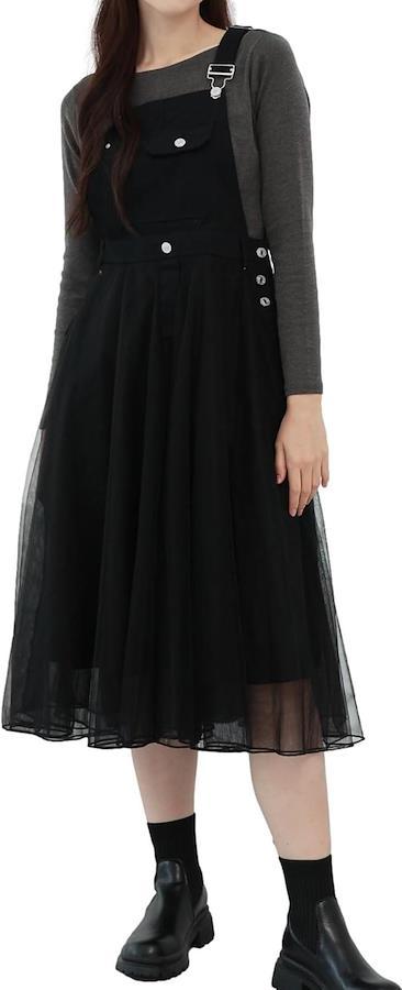 デニム素材のジャンパースカートにふんわりと揺れるチュールをドッキングしたアイテム。