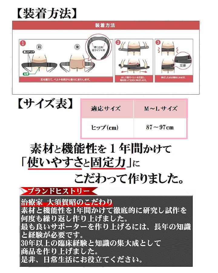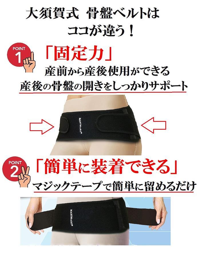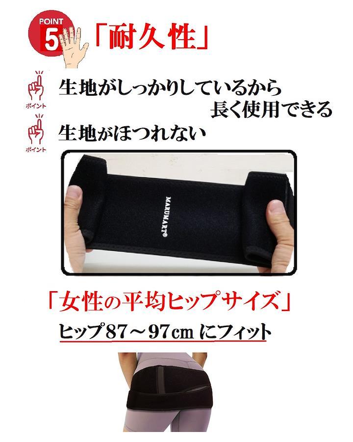 ベルトのずれは正しい装着方法で改善されます。またベルトの素材上、特有のゴムの嫌な匂いを感じる事が多々ございますが、当ベルトは特にいやな匂いを感じません。】臨床経験33年の柔道整復師専門家監修✅簡単に装着できる産後におすすめの産後骨盤ベルトタイプです。 産後だけではなく、産前・妊娠中・産後の骨盤サポートにも使用できる骨盤ベルトです。また腰痛ベルト&骨盤ベルトレディース用としてもご使用になれます。✅【骨盤ベルトの効果】妊娠中は出産に向けて少しずつ骨盤周辺が緩みやすくなります。産後は産褥ベルトとして、また骨盤を引き締めて骨盤が自然に元に戻ろうとする働きをサポートします。ベルトは、簡単に装着でき、人間工学に設計、体にぴったりフィットし、骨盤をキュッと引き締めます。骨盤サポート&産後骨盤ベルトとして使用できるマタニティベルトです。産前産後の骨盤サポートベルトとして、日々のマタニティライフをサポートします!✅【骨盤ベルトがずれにくい構造と汗の吸収と蒸れを抑える素材をベルト内面に使用】 左右両サイドから骨盤をしっかり押さえ込み、尚且つ滑り止めのステッチを補強して、座った姿勢や屈んだりする姿勢による、ベルトのずれを最小限に抑える構造に設計しています。 ベルトの調節は、簡単でできてサイズの調整も快適。産前産後でも使用できます。✅【骨盤ベルトがずれにくい素材と設計】 お尻部分はズレにくい素材を採用、お尻の形に合わせて設計されています。 動いてもズレにくく、しっかりと骨盤をホールドしてお尻のラインをアップさせます。✅【骨盤ベルトで姿勢をサポート】『妊娠時&産後の悩み解決』妊娠時におなかが大きくなるによって、骨盤による様々なお悩みをサポートします。簡易包装となります。説明書付き。MARUMARTブランドの登録商標です。【臨床経験33年の柔道整復師専門家監修】整骨院でも販売している大須賀式 骨盤ベルトの改良版、今回オンライン販売にて産後ベルト 骨盤サポート ベルト マタニティ ベルト用にてご提供いたします。 素材:ナイロン75%+ ポリエステル15%+ スパンデックス5%+PVC5% 商品の寸法:長さ135cm、幅4mm、高さ10.5cm。ベルトの規格サイズの目安:女性用Mサイズ~Lサイズ(適応サイズ: 87~97cm) ヒップサイズ87~97cmにフィット! ※女性のヒップサイズ平均値当社データ ※サイズを計測するところは、腹囲ではなく、骨盤(お尻中央)周りの長さになります。ベルトは、伸縮性があります。※お客様のヒップ寸法が大きくなった場合、サイズが合うものをお選び下さい。