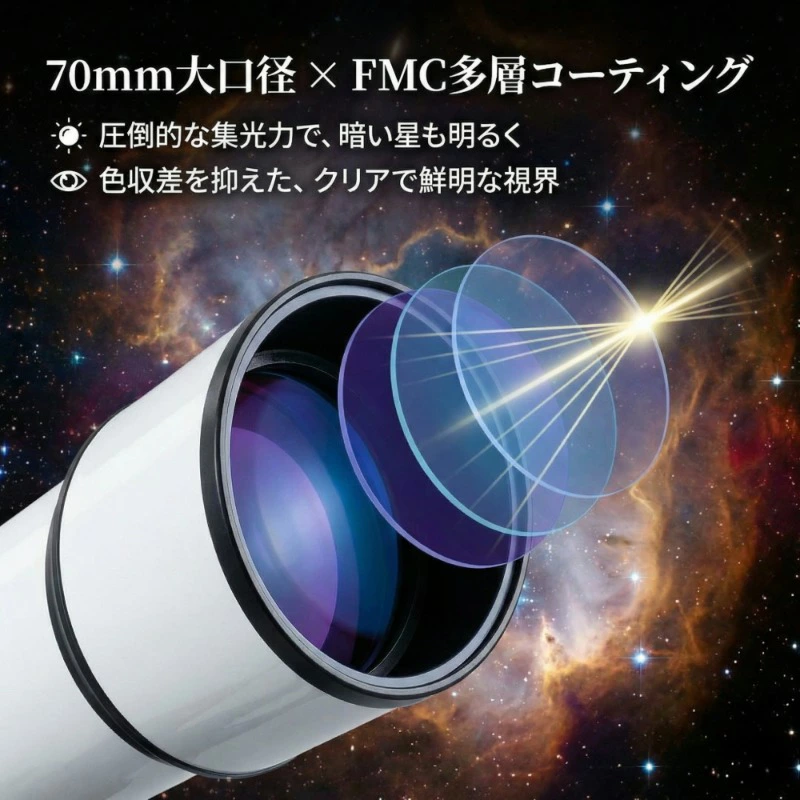・FMCマルチコートで光のロスと色収差を抑え、月面クレーターや惑星の模様もくっきり