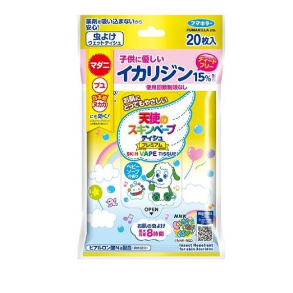 製品の特徴●フマキラー 天使のスキンベープティシュプレミアム NHKいないいないばあっ!●防除用医薬部外品●人気幼児番組「いないいないばあっ!」の虫よけにティシュタイプが仲間入り!●NHK Eテレで25年以上も放送されている人気幼児番組「いないいないばあっ!」のかわいい虫よけウェットティッシュです。●虫よけ成分〈イカリジン(*1)〉を15%配合したことにより、虫よけ効果が長持ちします。●有効成分として〈イカリジン(*1)〉を配合したディートフリーの虫よけです。お肌にやさしく、年齢や回数等お子様への使用制限もありません。●顔や首に塗りやすく舞い散りもないので、お子様にも安心して使えます。携帯しやすく、手も汚れないので外出先でも気軽に使えます。●マダニ、ヌカカ、ノミ、トコジラミにも効く。●潤水成分ヒアルロン酸Na配合で、お肌にしっとりなじむやさしい使い心地。ベビーソープの香りで、虫よけを塗るのを嫌がるお子様でも気持ち良く使えます。●皮膚アレルギーテスト済み(※すべての方にアレルギーが起きないということではありません。)●販売名:スキンベープG47