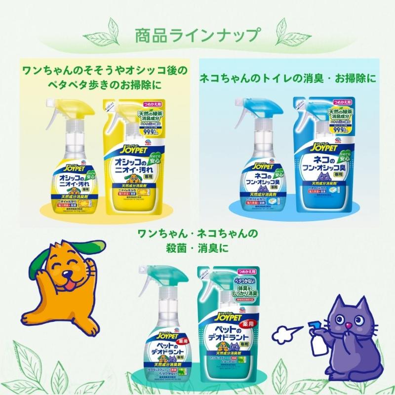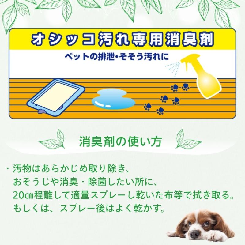 ・天然の緑茶消臭成分※が、ペット特有の気になるオシッコやウンチ臭を元から強力に消臭します。※消臭の有効成分は100%天然の植物抽出物です。・なめても安心。・除菌成分配合なので、トイレやケージにも効果的。(全ての菌を除菌するわけではありません)・そそうやオシッコ後のペタペタ歩きが気になるフローリング、カーペット、畳などのおそうじに・すっきりハーブの香り・ノンアルコール