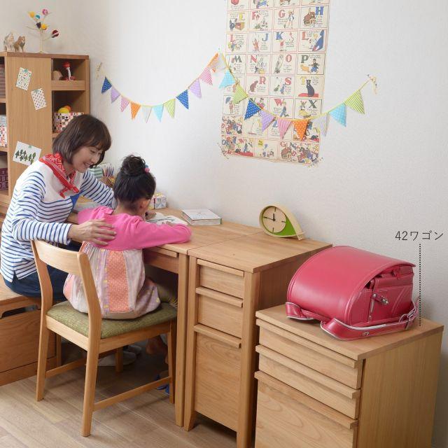 天板はイメージ写真のようにランドセルがちょうどよく置けるサイズ感。愛着を持ってご使用いただけるよう、取っ手は触れるたび木の素材感を感じられるデザインにしました。