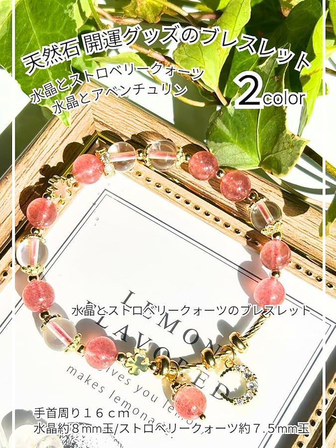 「サイズ」手首周り16cm/水晶約8mm玉/ストロベリークォーツ約7.5mm玉/アベンチュリン約8mm玉